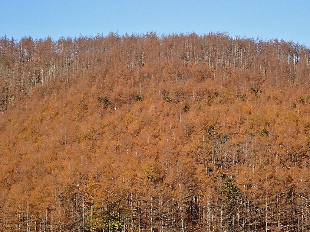蓼科山、北横岳と一面のカラマツの黄葉。
