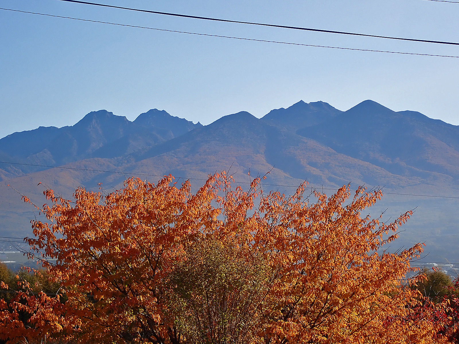 赤岳、横岳、硫黄岳。中腹の紅葉が鮮やかです。