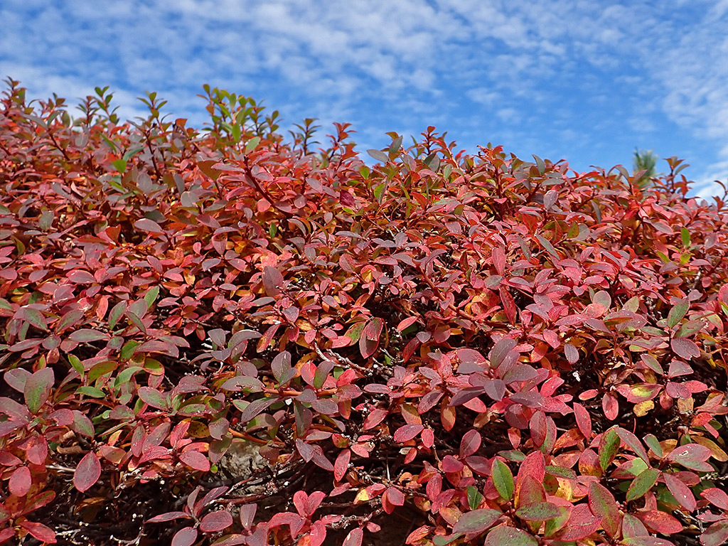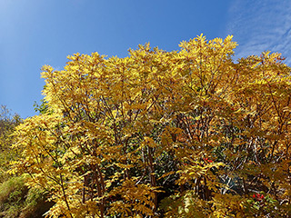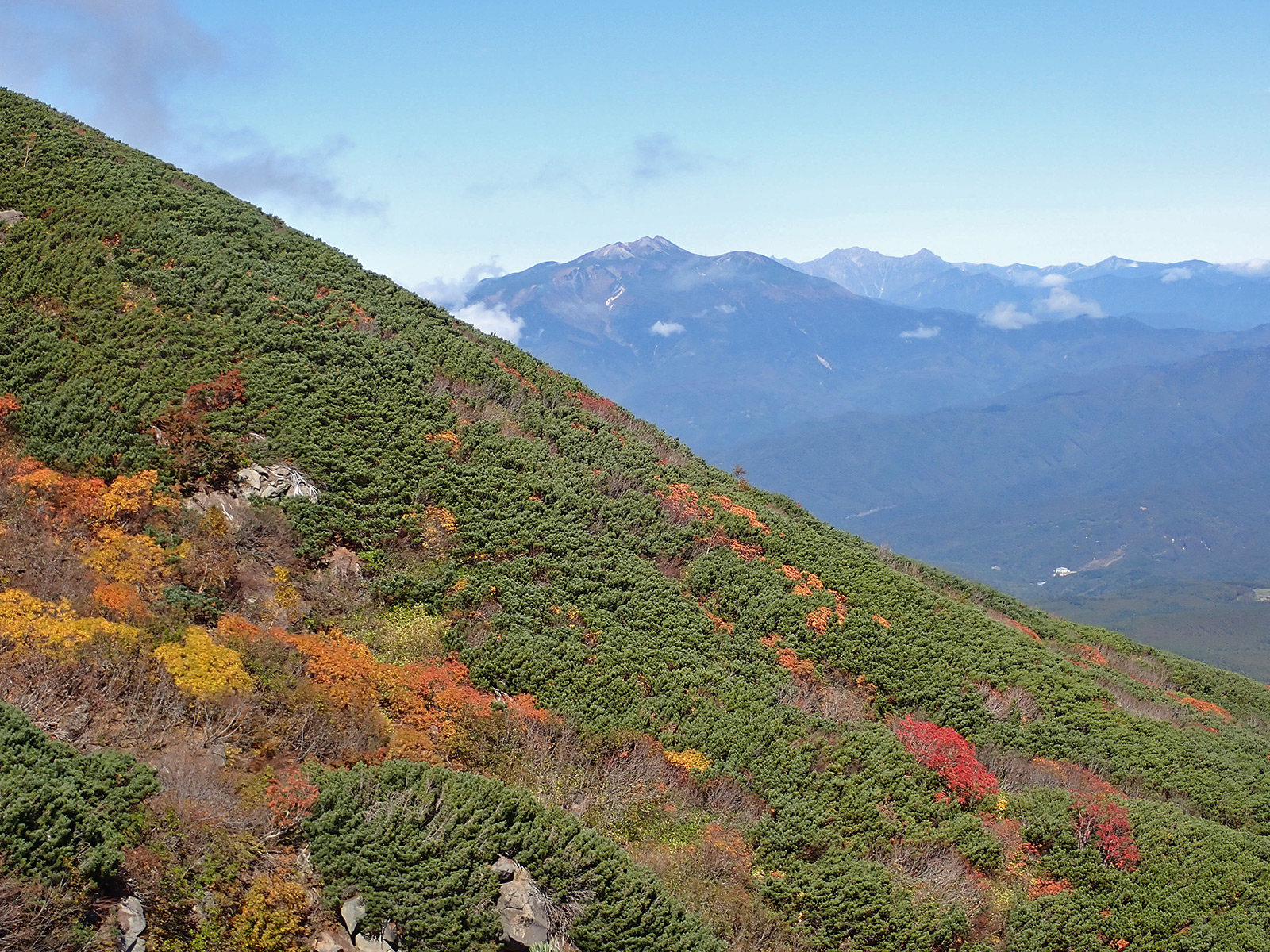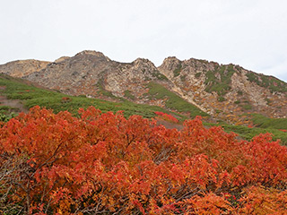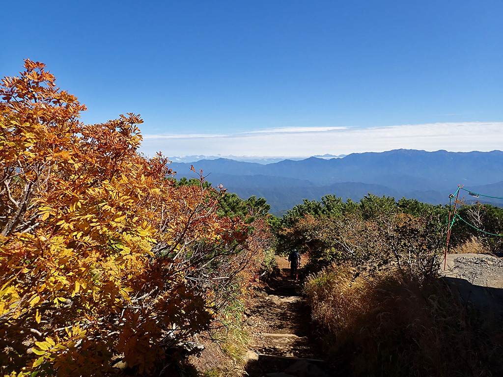 登山道脇で紅葉が増えてきますが、青空が欲しいです。