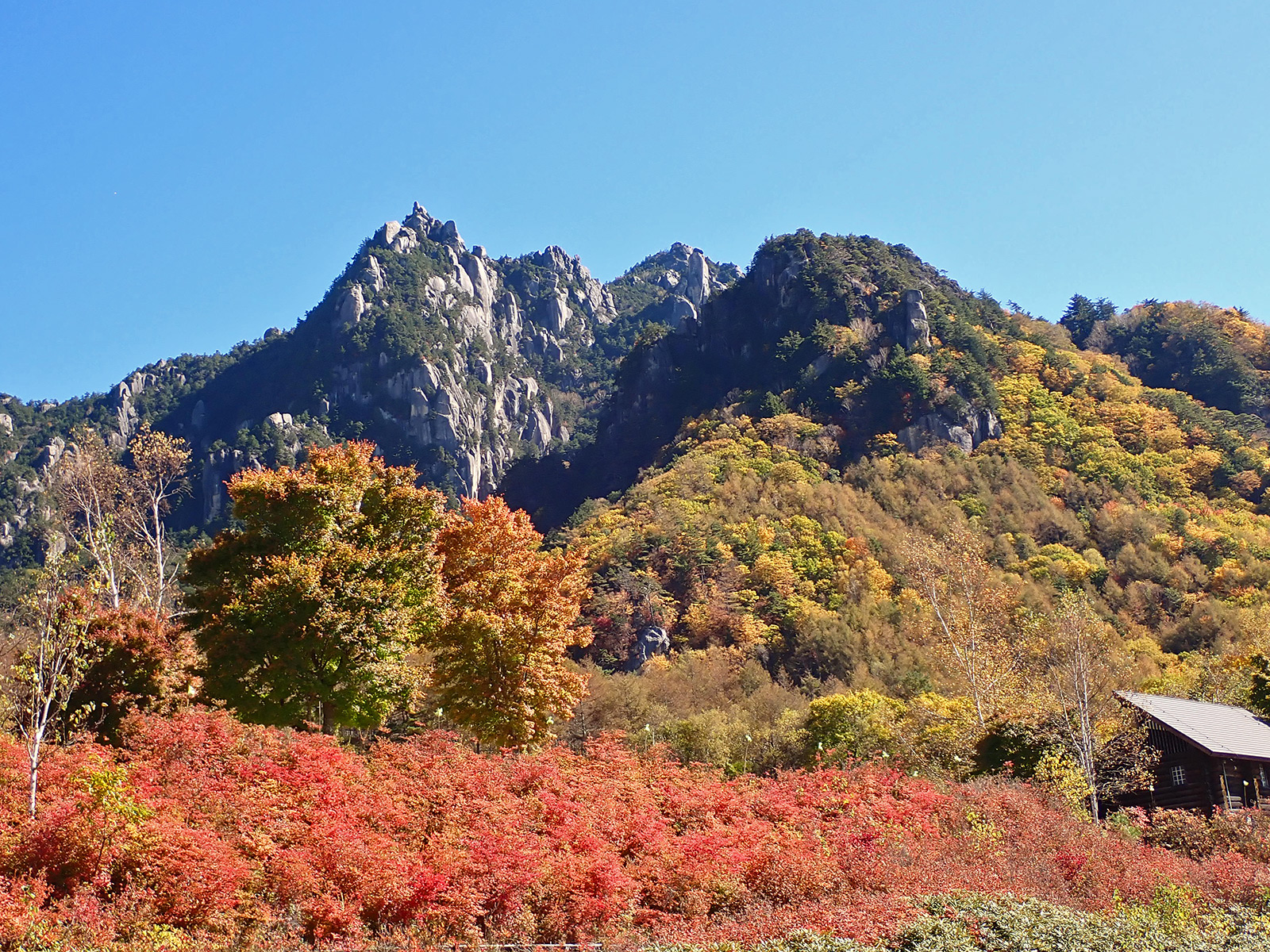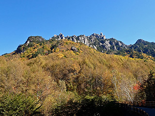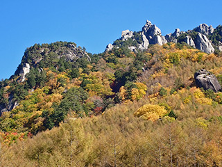 ここからは車で帰る途中で撮影したもの。一面の黄葉と瑞牆山。