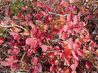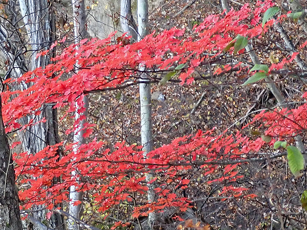下っていく林道沿いに真っ赤な紅葉が。これは鮮やかです。