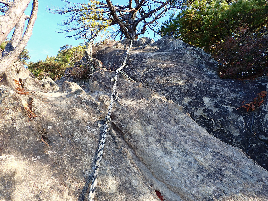 山頂直下は岩場の急登が続きます。常にロープが用意され、登りやすくなっています。