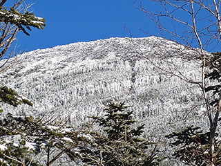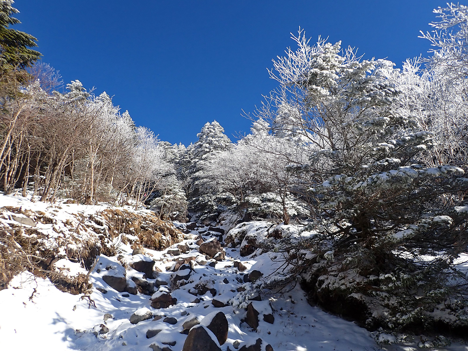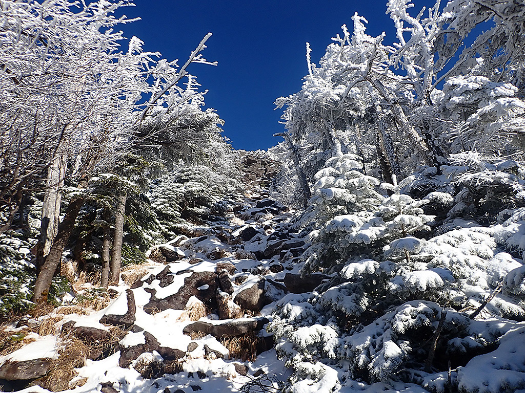 昨日の午後、八ヶ岳の稜線が真っ白になっていましたので、今シーズン初の雪山を楽しみに地元の蓼科山に出かけて来ました。 雪は登山口ではほぼゼロでしたが、2番目の急登から一面真っ白になり、念のためアイゼンを装着して歩きましたが、上部でも10cm程度しか雪は無く、微妙な積雪でした。それでも足元も真っ白、見上がると木々も霧氷で真っ白になっていて、今シーズン初の雪山をたっぷりと満喫することが出来ました。