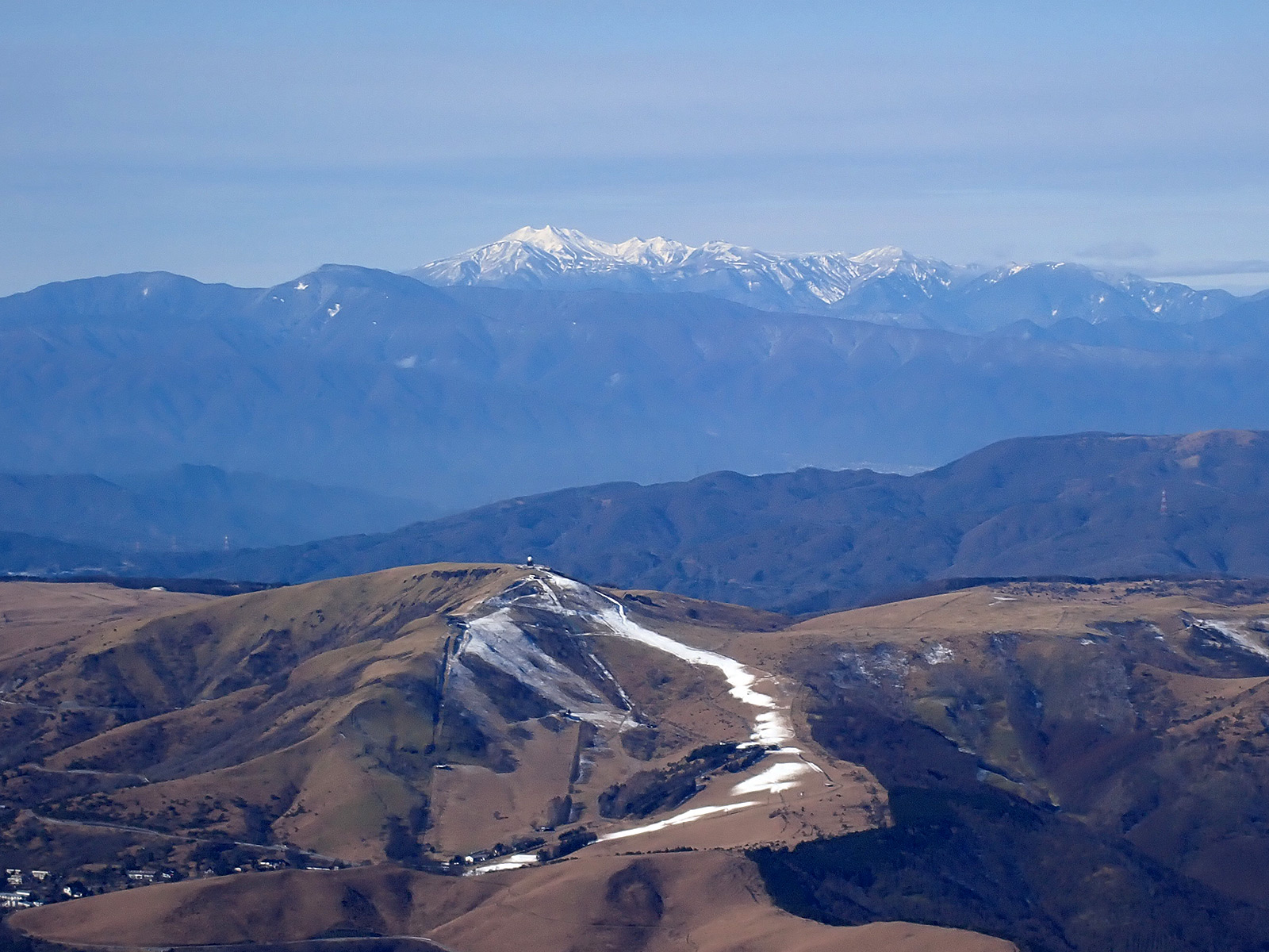 乗鞍岳。もしかして今日は滑れるのか?。手前の車山も雪を作っています。ただ今シーズン、エコーバレーが営業しないのはちょっと残念。