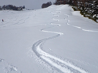 今季最強の寒波で乗鞍や北アルプスはたっぷり新雪が積もったようですので、カモシカパウダーを期待してこの日の朝、今シーズン初となる乗鞍に出かけてきました。 リフトを使えば少し楽を出来ますが、その頃にはノートラックバーンが少なくなっていそうということで、営業前のゲレンデを歩いて登りました。ただもっと早い人もいて私は確か5人目でした(^^;。 そして期待通り、かもしかゲレンデに降り積もった30cmオーバーの新雪を気持ち良く滑ることが出来ました。