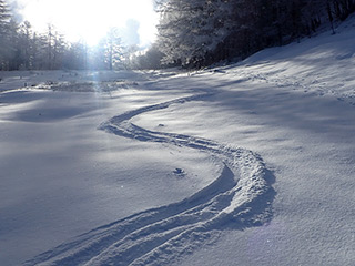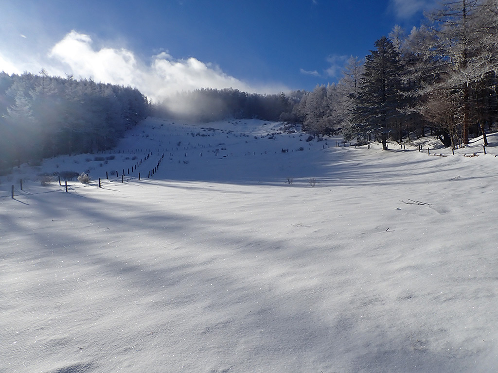 前日に里でも雪が舞い、上の方は少しは積もったのではと期待して、今シーズン初バックカントリーに入笠山に出かけて来ました。 まだ積雪は多くありませんが、それでも10cmほどの新雪で一面真っ白になっていて、初の本格的冬山を楽しむことが出来ました。