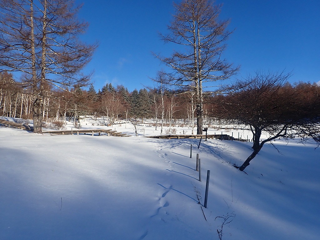 吹き溜まりでは10cmほど。まだスノーシューは楽しめません。