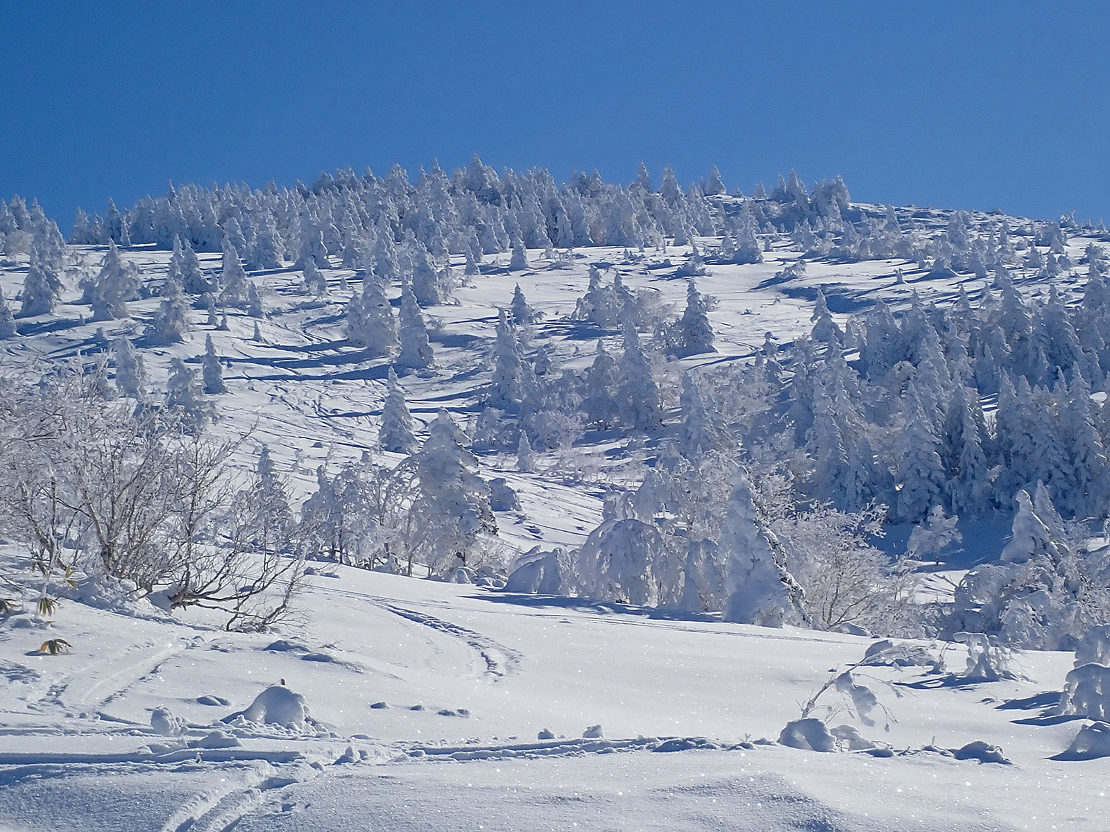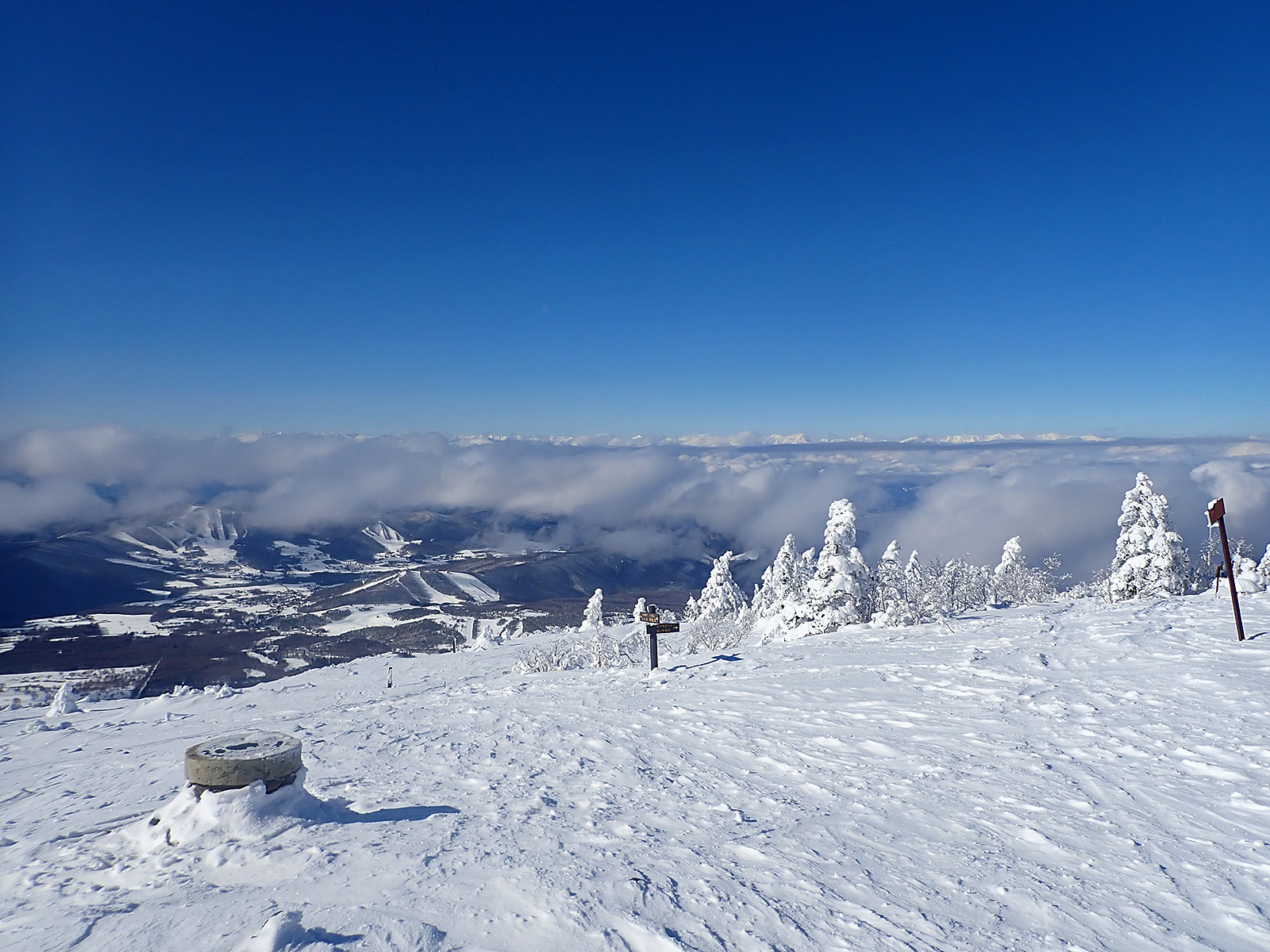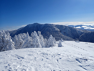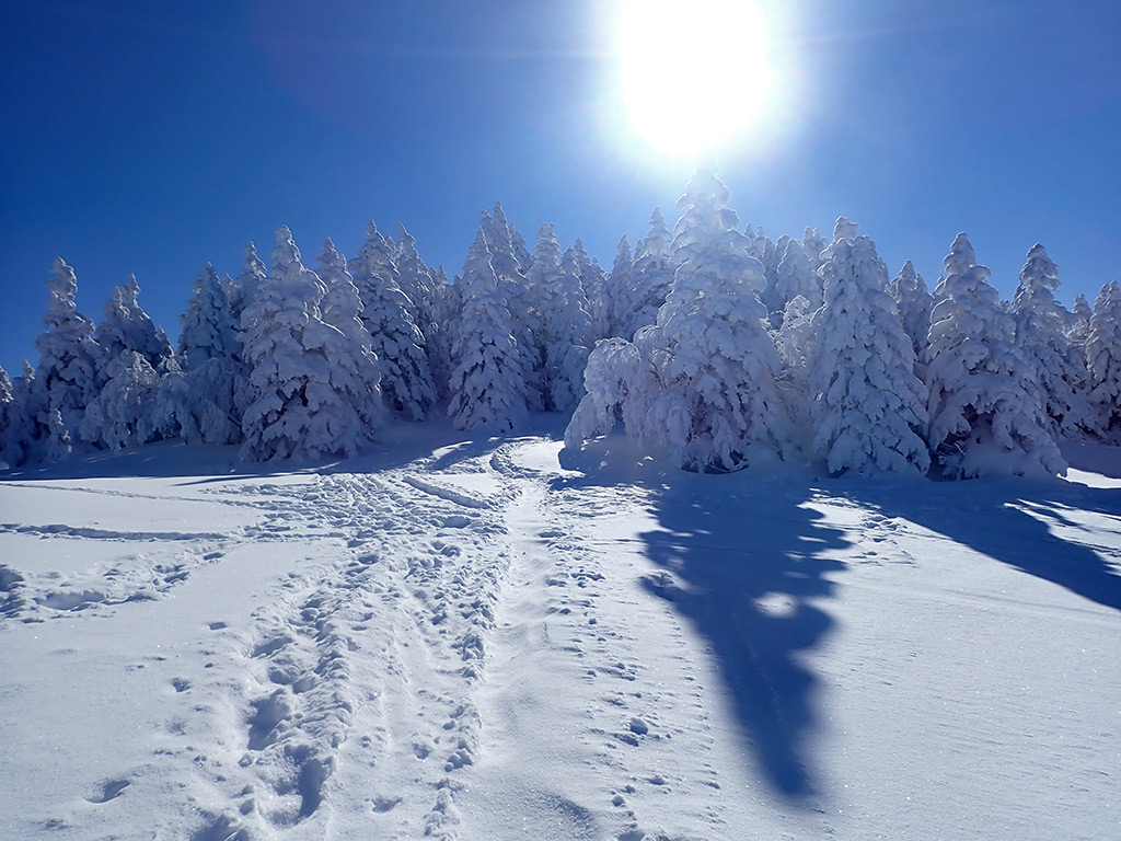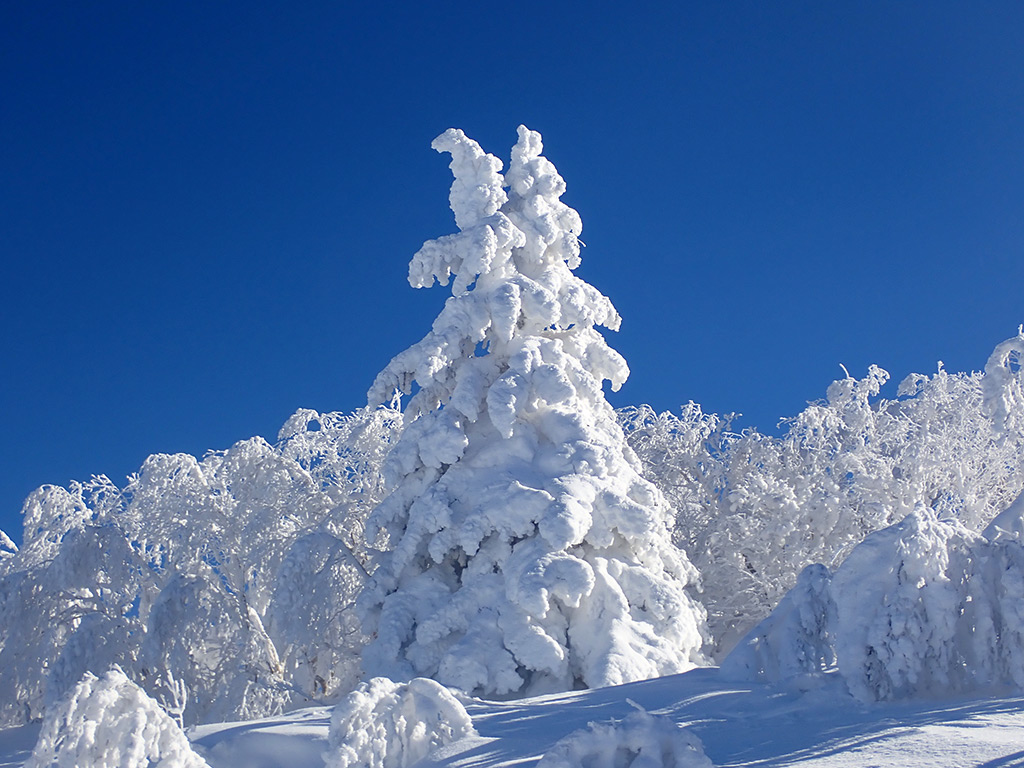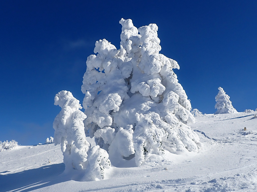 この日は明日からの猛烈な寒波の前の晴れ間が期待できましたので、晴れる可能性が高そうな根子岳に15年ぶりに出かけて来ました。15年前はうろこのテレマーク+革靴で登って滑ったのが懐かしいです。 さて、朝の根子岳の天気は期待通りの快晴で気持ちも高まります。リフトを1本乗ってからシールで歩き始めますが、どうもこの日は私が最初のようで、山頂に着くまで誰とも会いませんでした。 ツアーコースはシュプールいっぱい、そしてしっかりしたトレースが付けられていて、トレースをたどって登って行きます。ツアーコースの周囲も滑るところが沢山ありますので、下りはできるだけノートラックバーンを選んで滑りました。 締まった雪の上にさらさらの新雪が10〜15cmほど積もっていて、よく走るパウダーで気持ち良かったです。 また山頂近くは沢山のモンスターにであうことが出来て、念願が叶いました(^^)。