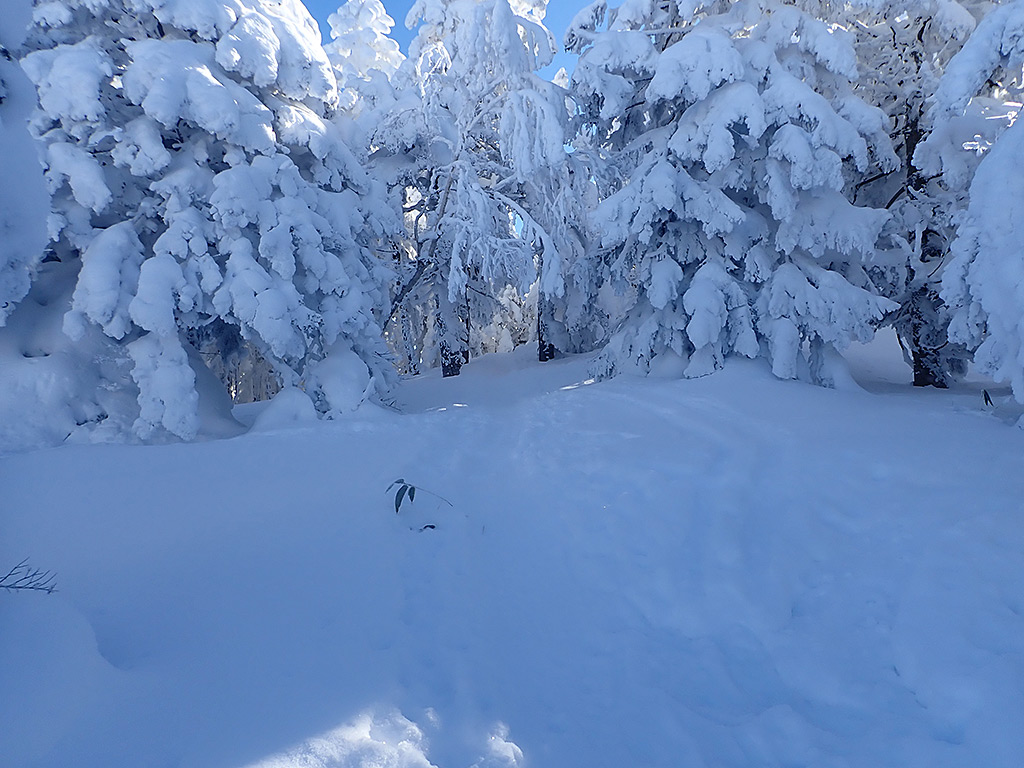 真っ白な森の中を進みます。本当はこの森の中で無く、右側を迂回した方が登りやすかった。