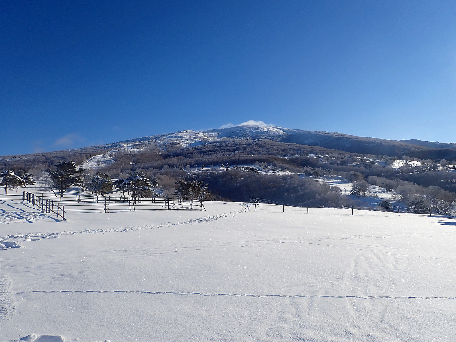 根子岳は斜度があまり無いのでディープだと下りラッセルになる恐れもあり、これくらいの積雪が滑りやすいのかも。