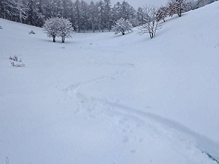 その帰り、ふと見ると姫木平のスキー場跡の斜面が真っ白に見えましたので、久しぶりに立ち寄ってみました。 標高が低いので雪質が心配でしたが、案の定激重の深雪で登るのも下るのも苦労しました。でも今回の降雪で藪はほぼ埋まっていますので、次にさらさらパウダーが積もれば快適な斜面になりそうです。