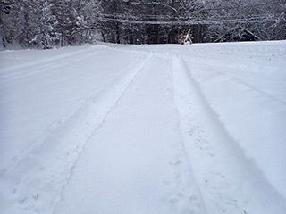 この深い轍は除雪車のものかな。未除雪の場所は30cmほどの新雪が積もっています。