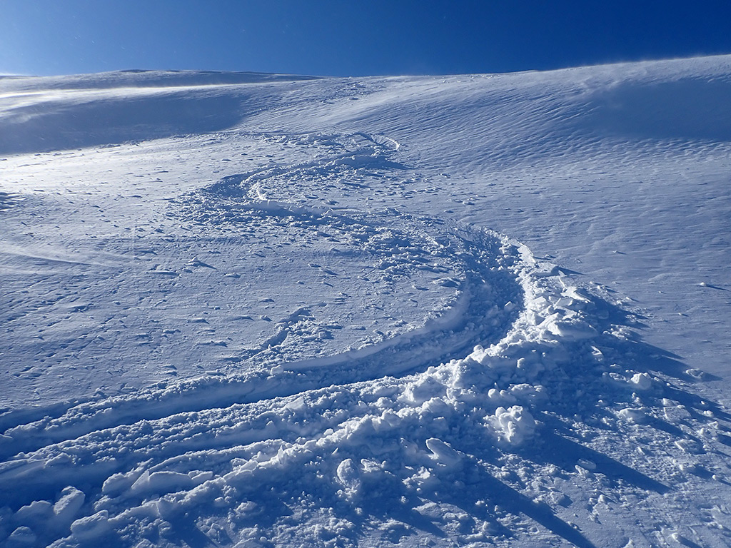 滑った山頂直下のルートをズーム。風でたたかれた部分が多いですが、風の影響の少ないルートを滑りました。