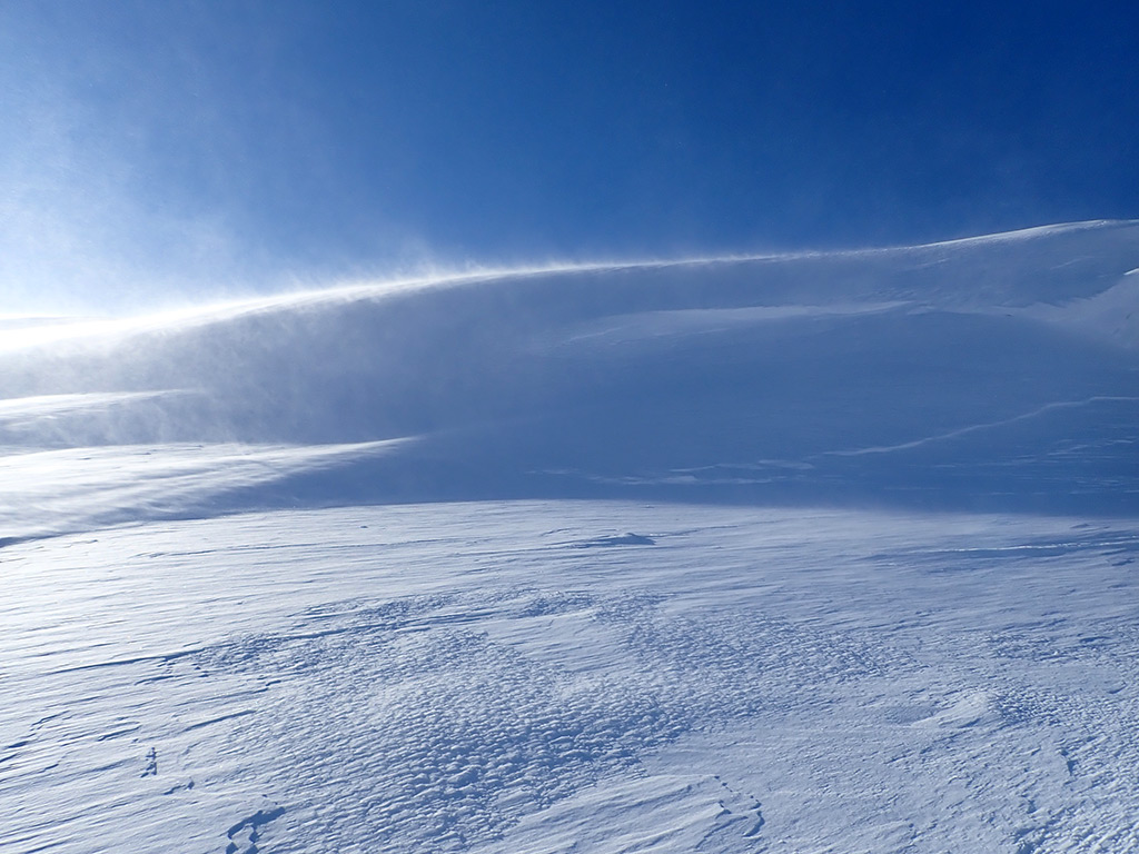 最近降った新雪が吹き溜まっていることを期待して、11日ぶりとなる車山に出かけて来ました。天気予報でも強風が予想されていましたが、実際にも足元はほぼ地吹雪という感じで暴風が吹き荒れ、稜線はほぼかちかち、北面も広く風が当たってパック気味となっていて、状態はあまりよくありませんでした。それでも山頂直下の急斜面を風の影響が少ないルートで滑り降りましたが、吹き溜まりのまあまあのパウダーを気持ち良く滑ることが出来ました。