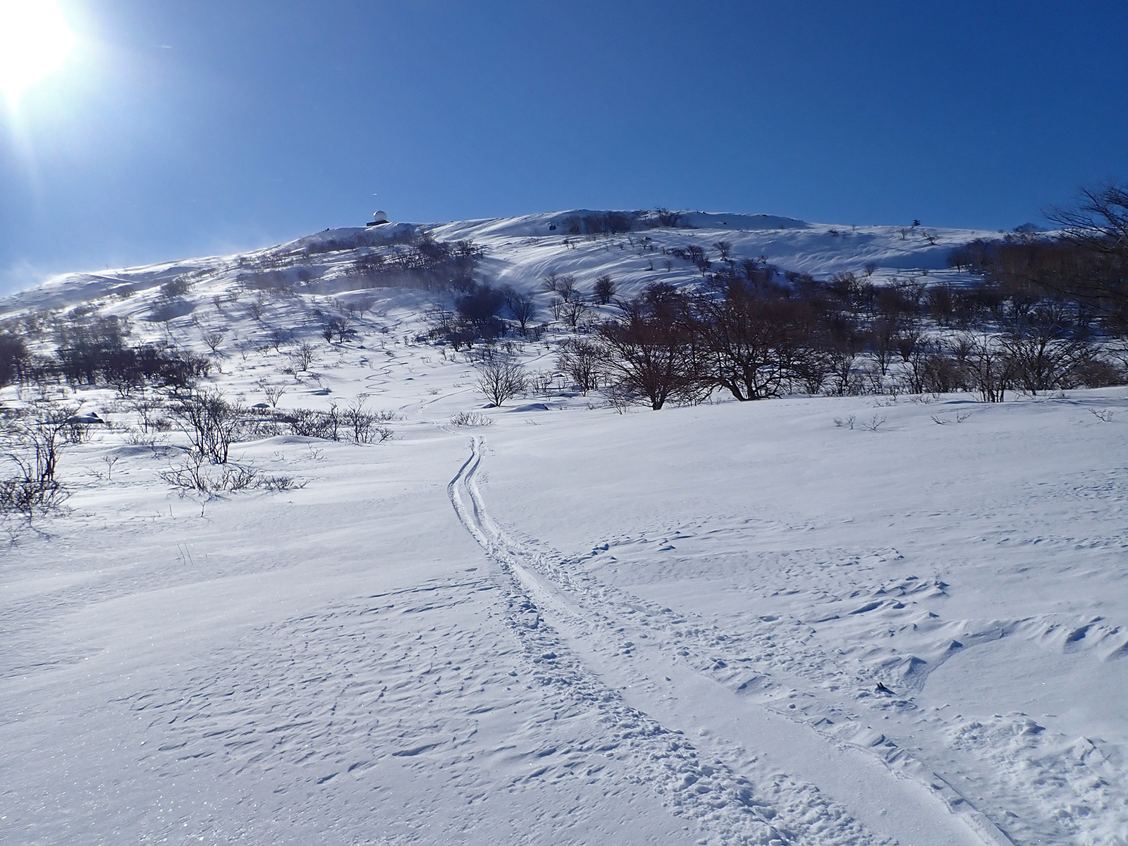 車山北面をはじめて訪れる人は、この標識から北面に進むと一番上の急な段差を迂回できます。雪が良ければここから滑りますが、見渡す限りハードパックかがりがりなので、吹き溜まりを求めて今回は山頂直下の斜面を滑ってみることにします。