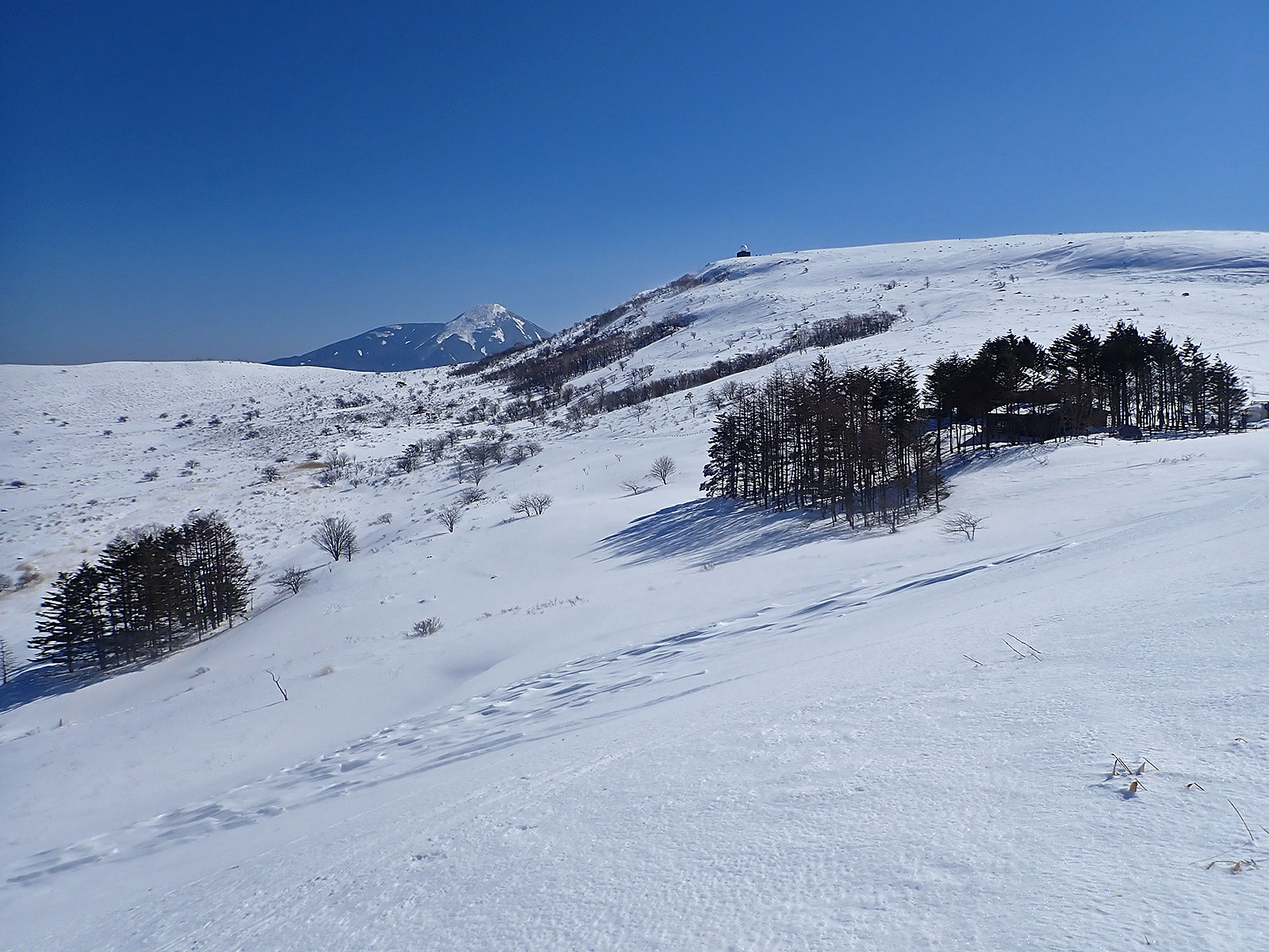 車山北面の様子。予想通り山頂直下のルートが吹き溜まっていそう。
