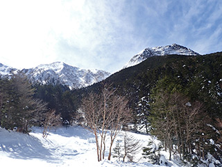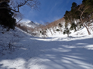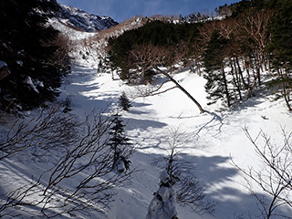 南沢へ進みます。途中アイスバーンや岩場があるのは分かっているので、板はザックに付けたままです。北沢ならシールで歩けそう。