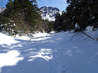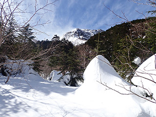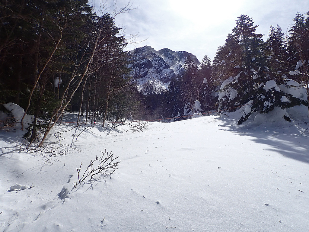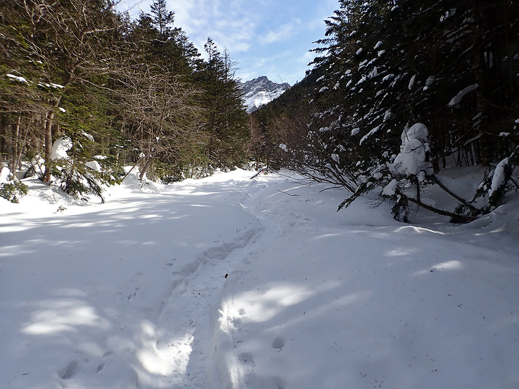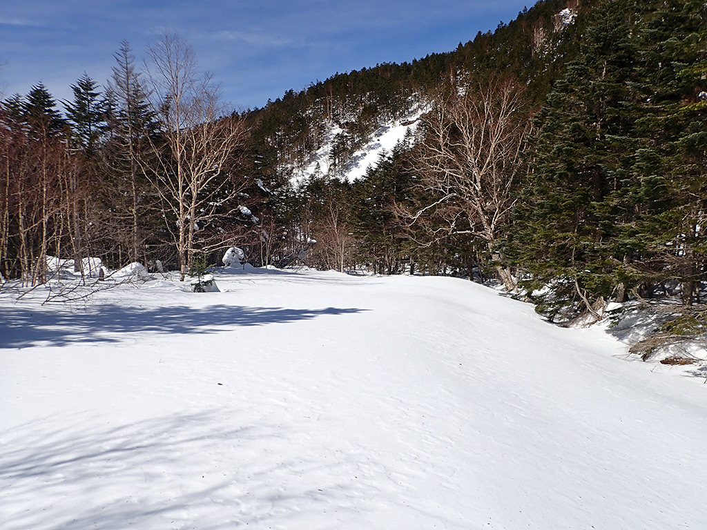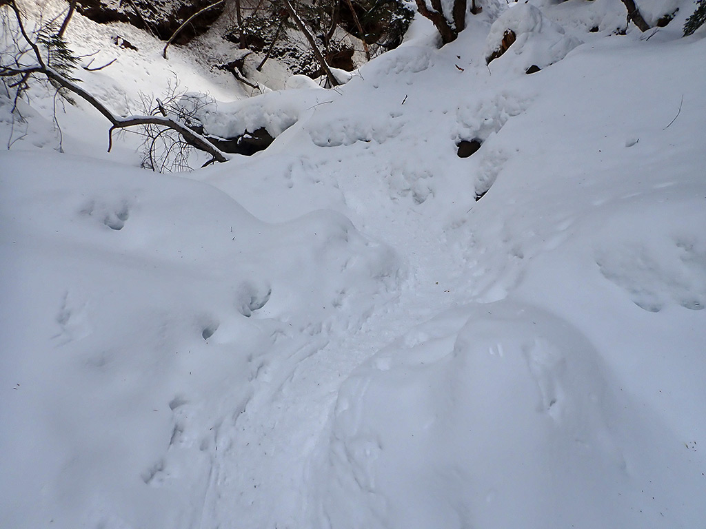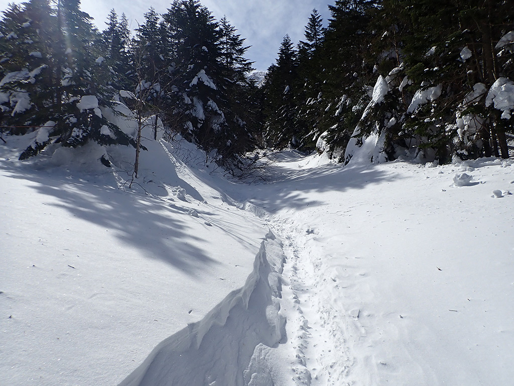 でも南沢中間地点のこの辺りは雪はたっぷりでした。吹き溜まりの柔らかい雪が10cm以上積もっていて期待したのですが(^^;。