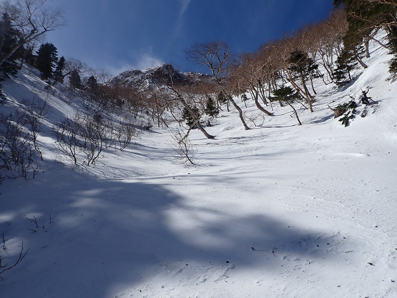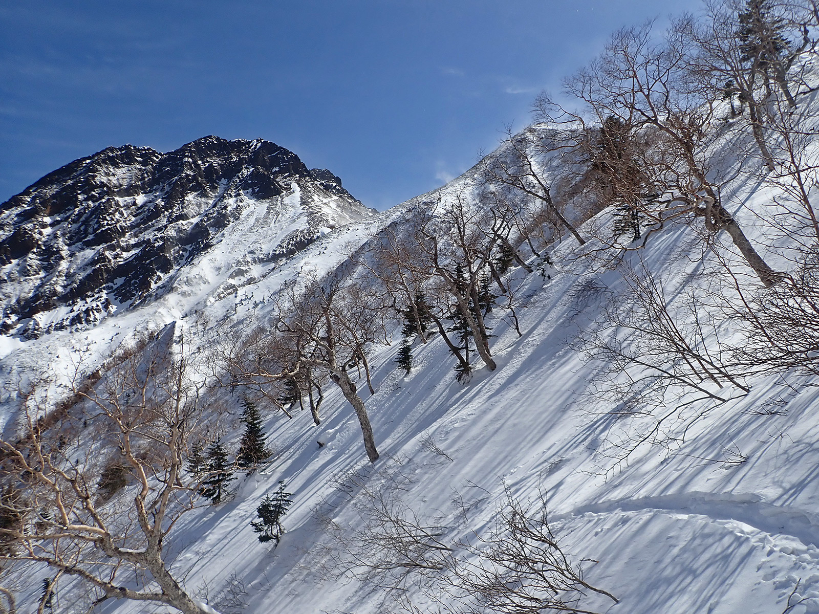 阿弥陀岳北陵。実は北陵のボウル状の斜面も気になっていましたので、今日はそちらに向かうことにします。あのダケカンバの疎林の斜面です。