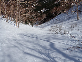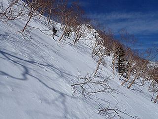 登山道脇のこの斜面を後で滑り降りました。風の影響でもっさりですが15cmほどの新雪が積もっています。