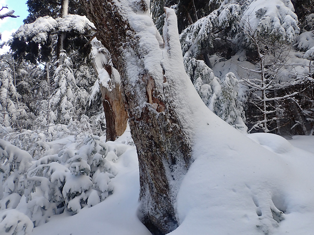 大きな岩はすっかり埋まっています。新雪が深く、ジグを切って登るのにも難儀しました。