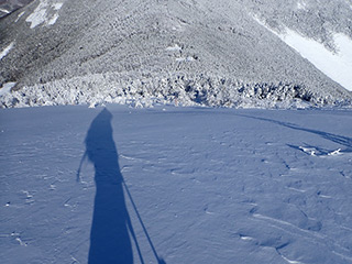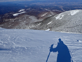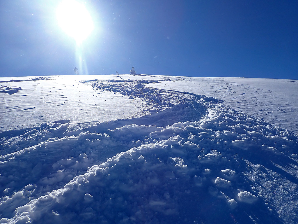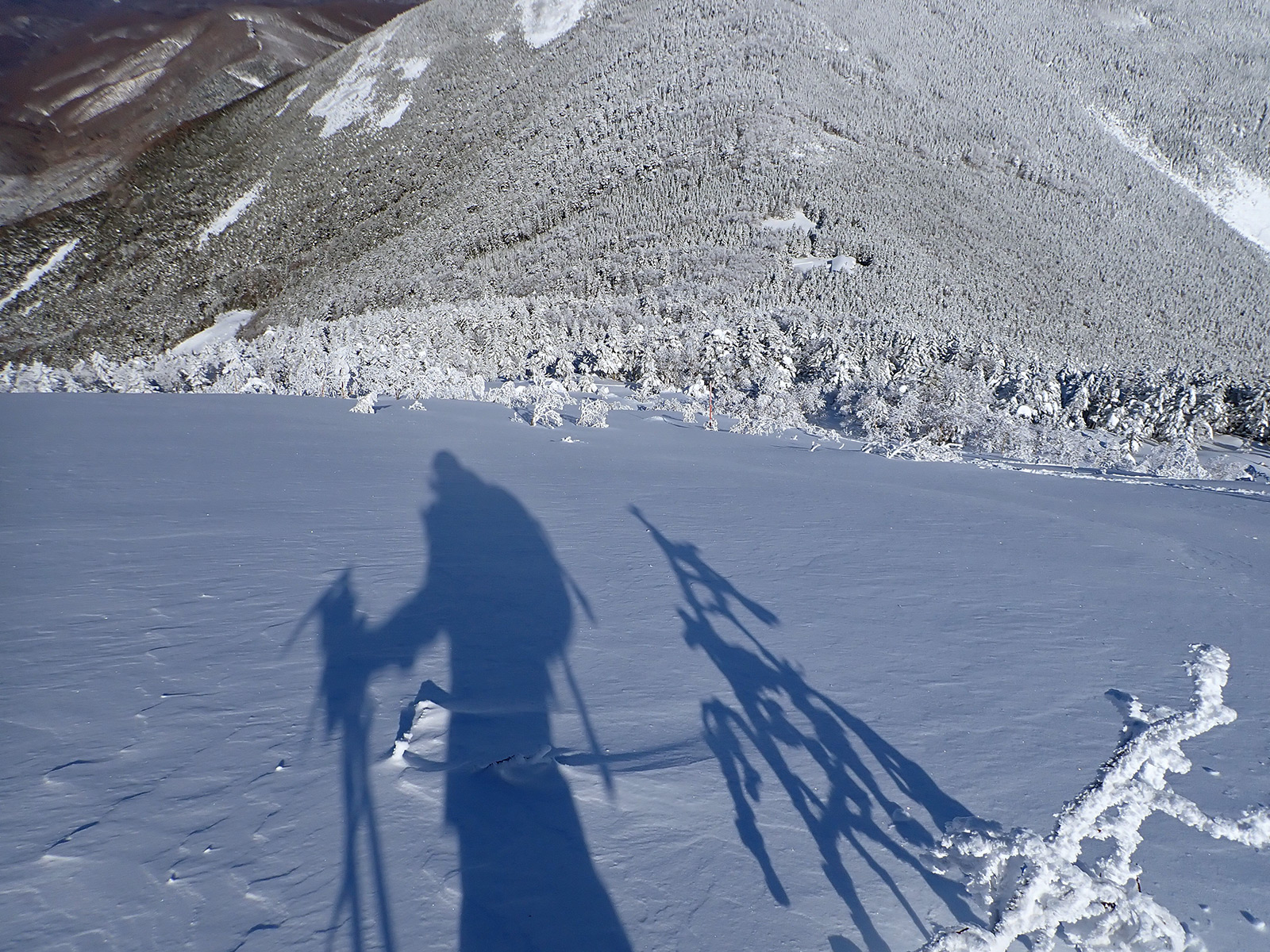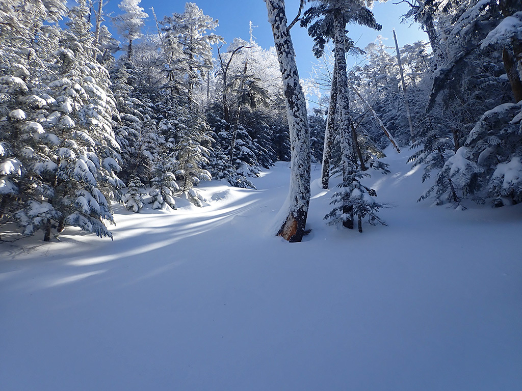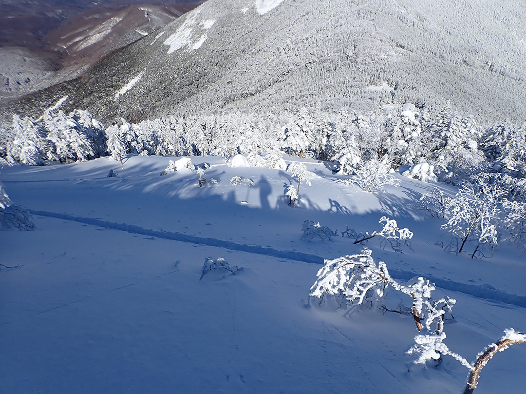 30cm以上の柔らかい雪が一面に積もっています。稜線直下の急斜面は風が当たるとハードパックになり、日射が当たるとサンクラストになりますので、こんな状態の良いのは久しぶりです。