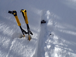 登山道の雪の状態が良いので、今回は帰りは登山道を滑って下りることにします。