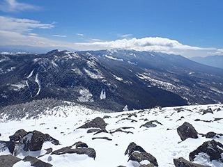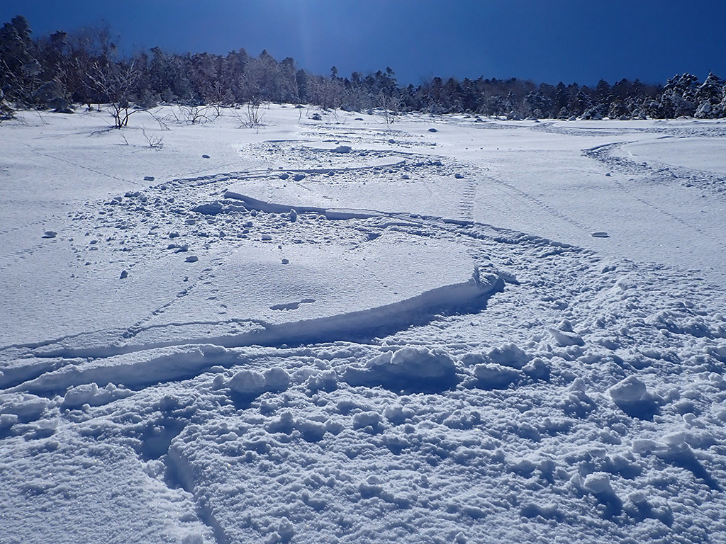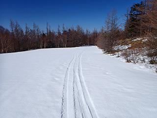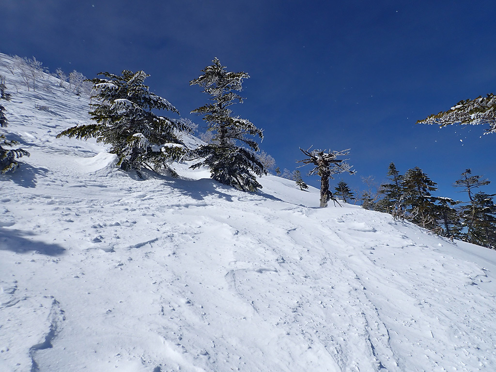 樹林帯から先の斜面は強風の影響をかなり受けていて状態もあまり良く無さそうでしたので、登った東斜面を途中まで滑り降り、北面側にトラバースしましたが、なんと北面側にはさらさらの新雪が吹き溜まっていて、それからはパウダーを気持ち良く滑ることが出来ました。 北面オープンバーンは上部は岩もほぼ埋まり快適な状況でした。ただ中間部は岩がだいぶ目立つようになり、滑る際には注意が必要です。 登山道に復帰してからゲレンデに戻るまでは修行の滑りでした(^^;。