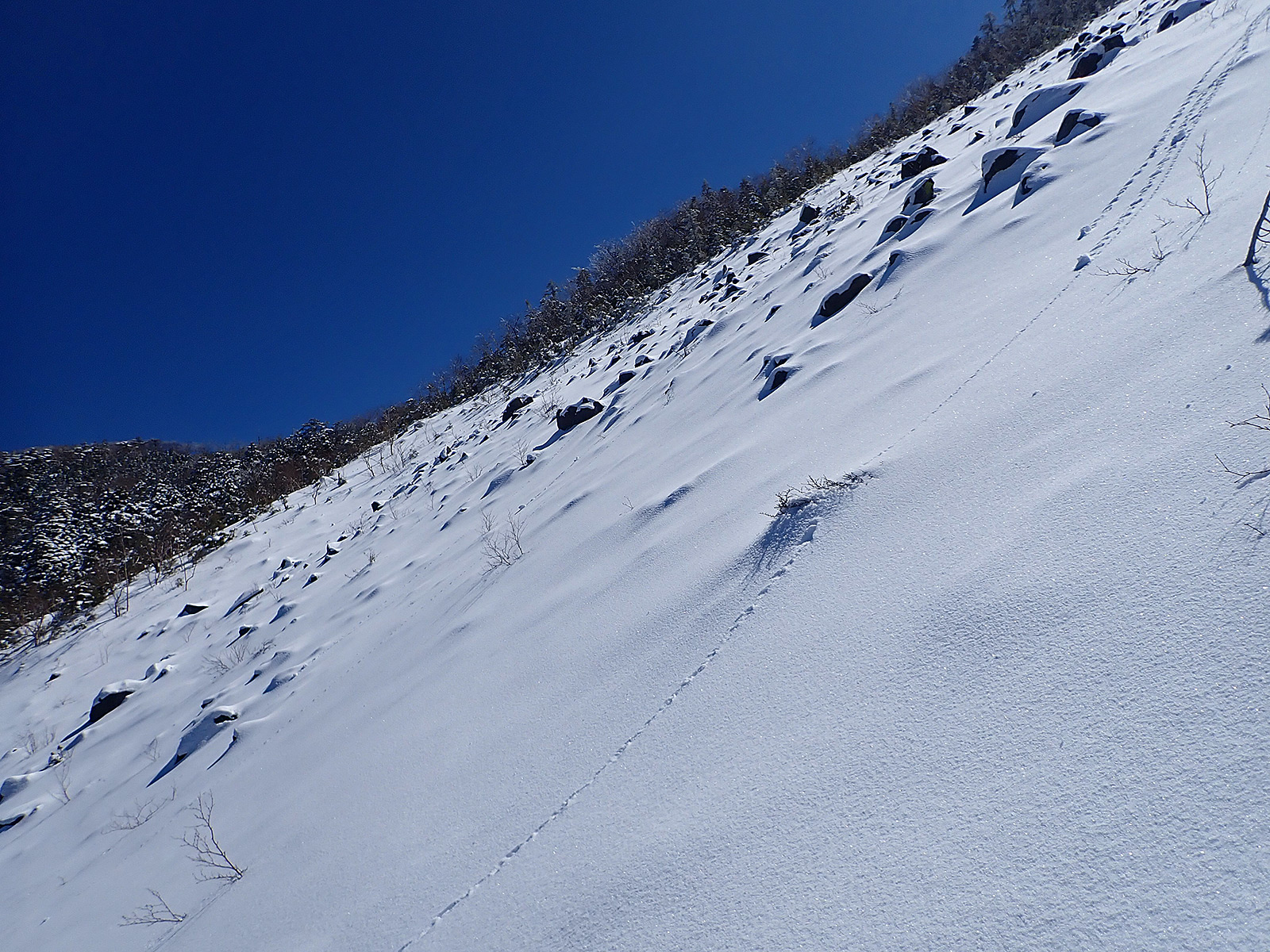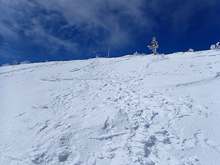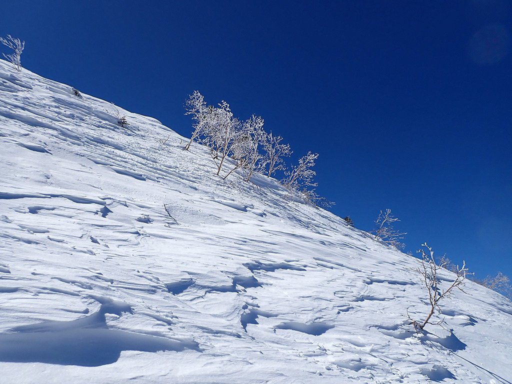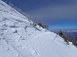 途中から斜面をトラバース気味に登って行きます。昨日の強風の影響かパック気味の新雪が10cmほど。