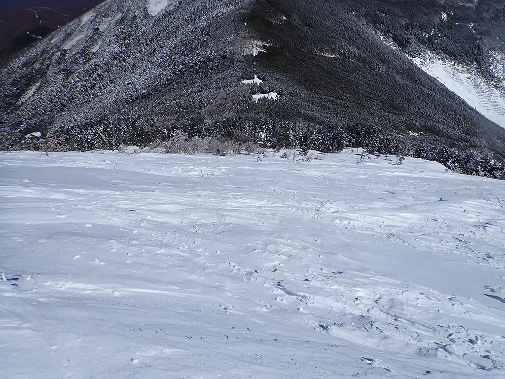 稜線は新雪が吹き飛ばされて全体的にクラスト気味。