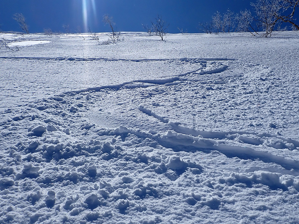 北面オープンバーンに出ました。昨日と思われるシュプールは4人分。なんとかノートラックを滑れそうで一安心(^^)。