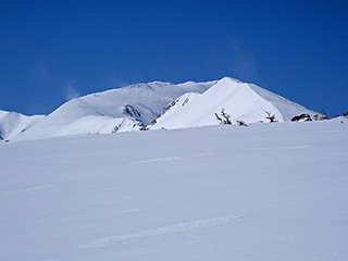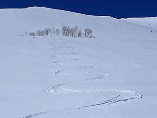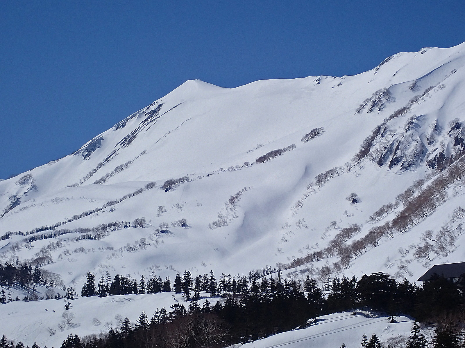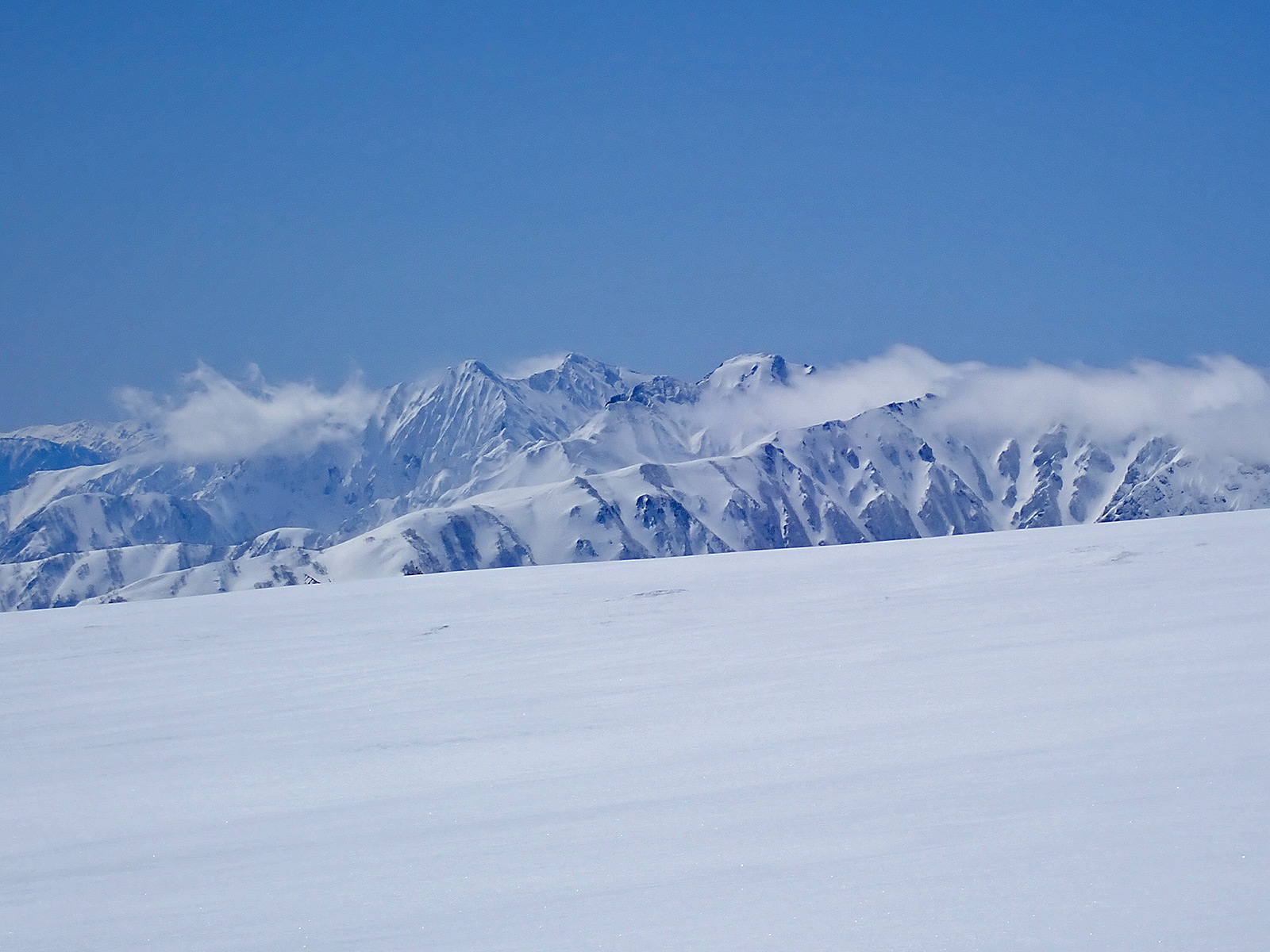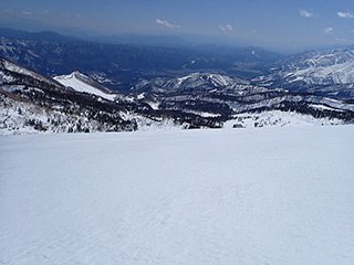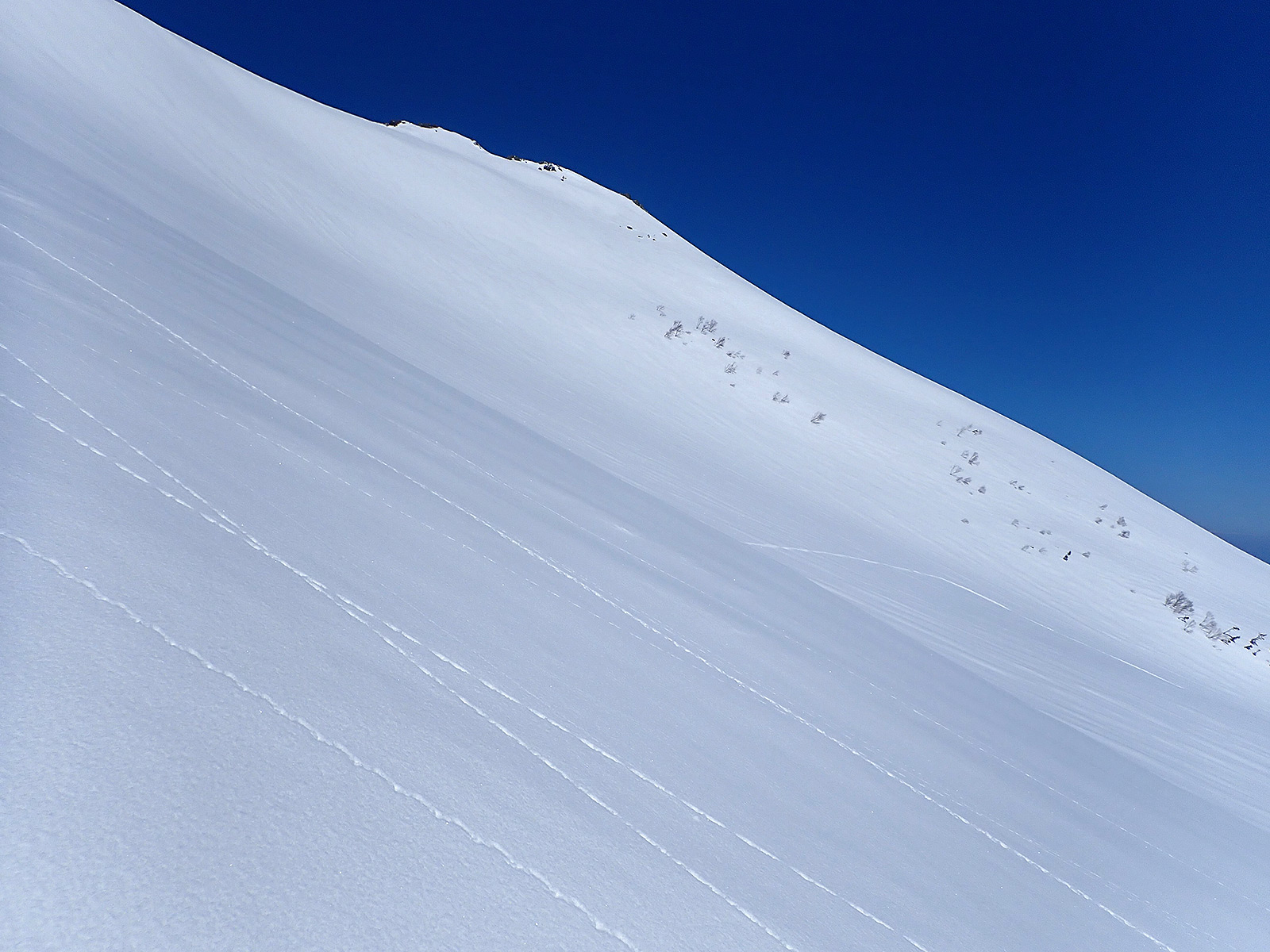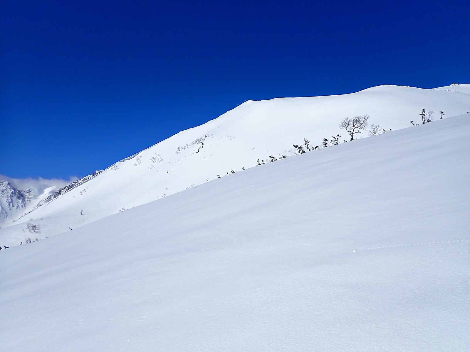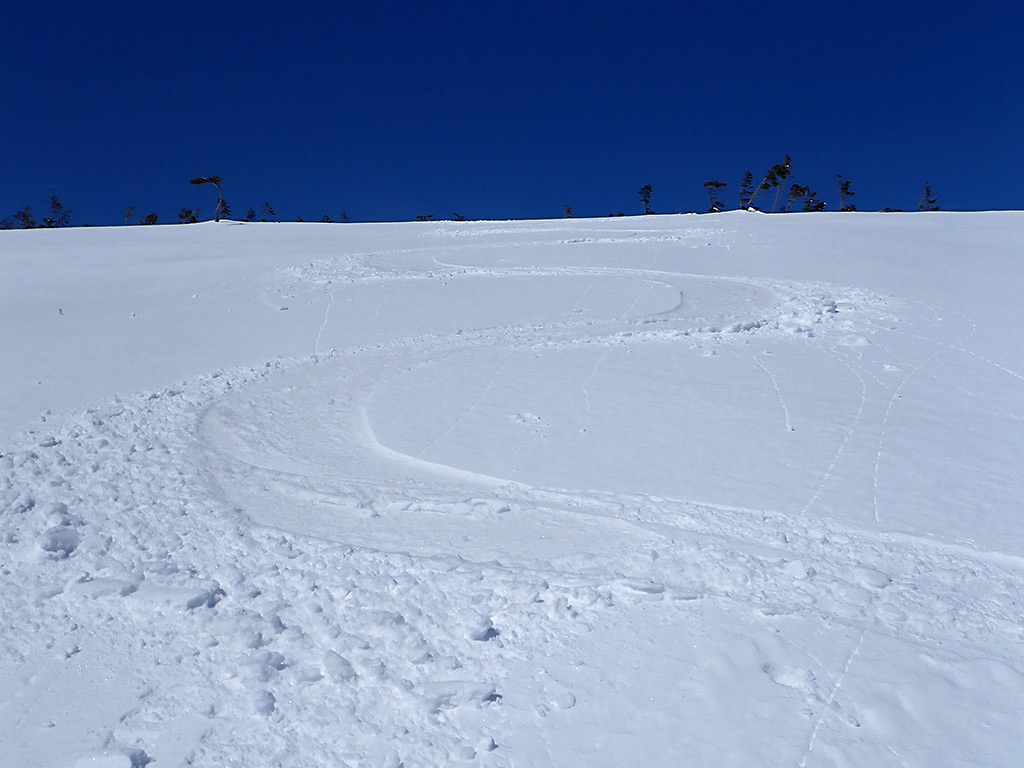 ゲレンデ上部で10cm、白馬乗鞍岳東斜面で20cmほど積もっていることを期待していたのですが、実際にはゲレンデはほぼゼロ(^^;、天狗原手前の急斜面から数センチほど、白馬乗鞍岳斜面では20cmほど吹き溜まっている部分もありましたが、滑った範囲では数cmから10cmほどという感じでした。さらさらでも無く、ざらめでも無く、新雪と言うよりは下の堅めの斜面を滑っている感触でちょっと不完全燃焼気味でしたが(^^;、それでも一面真っ白の斜面を滑るのは気持ちが良かったです。