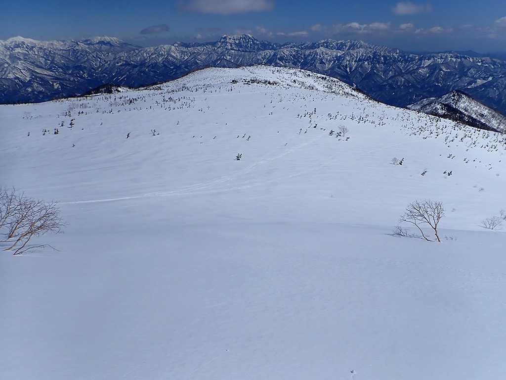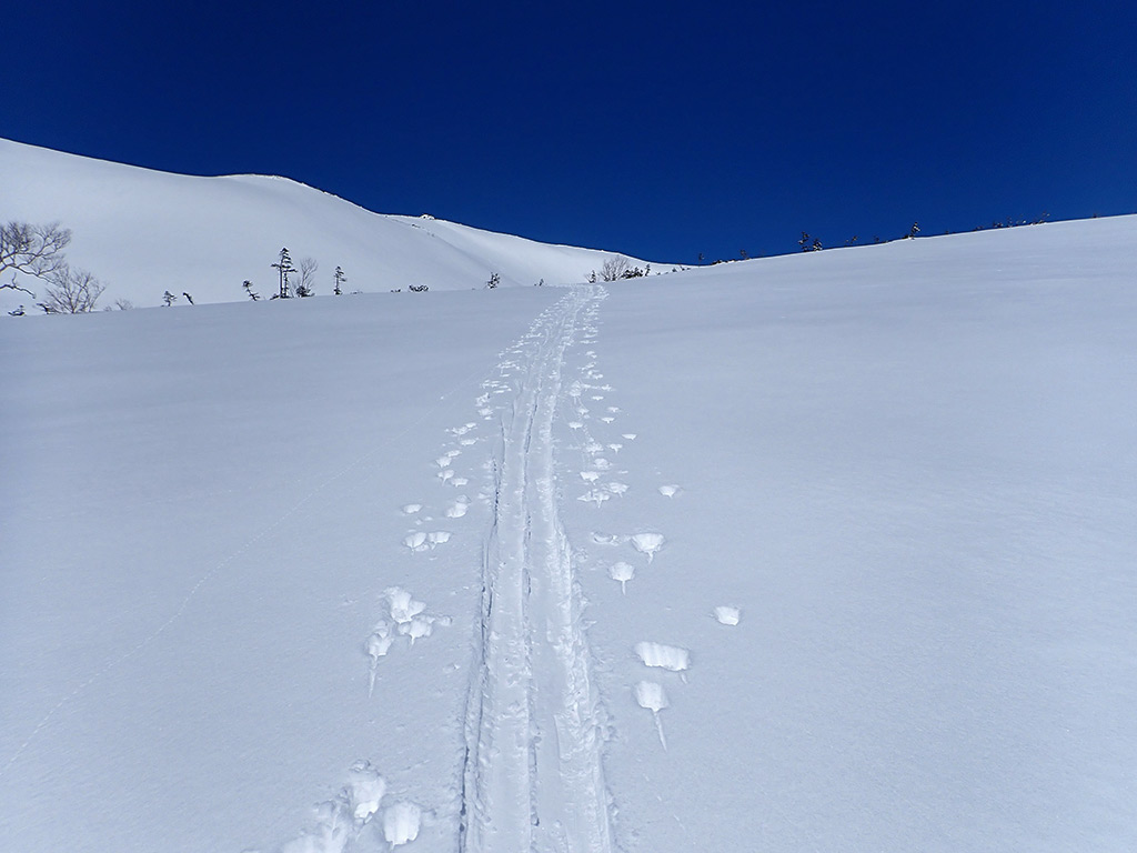天狗原に出ると、やっと柔らかい新雪が5cmほどになりました。