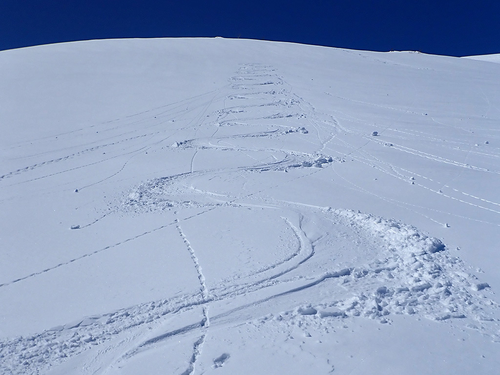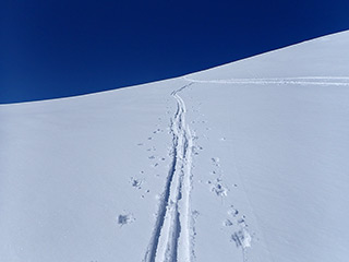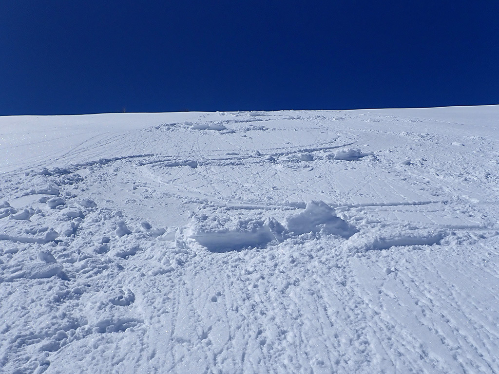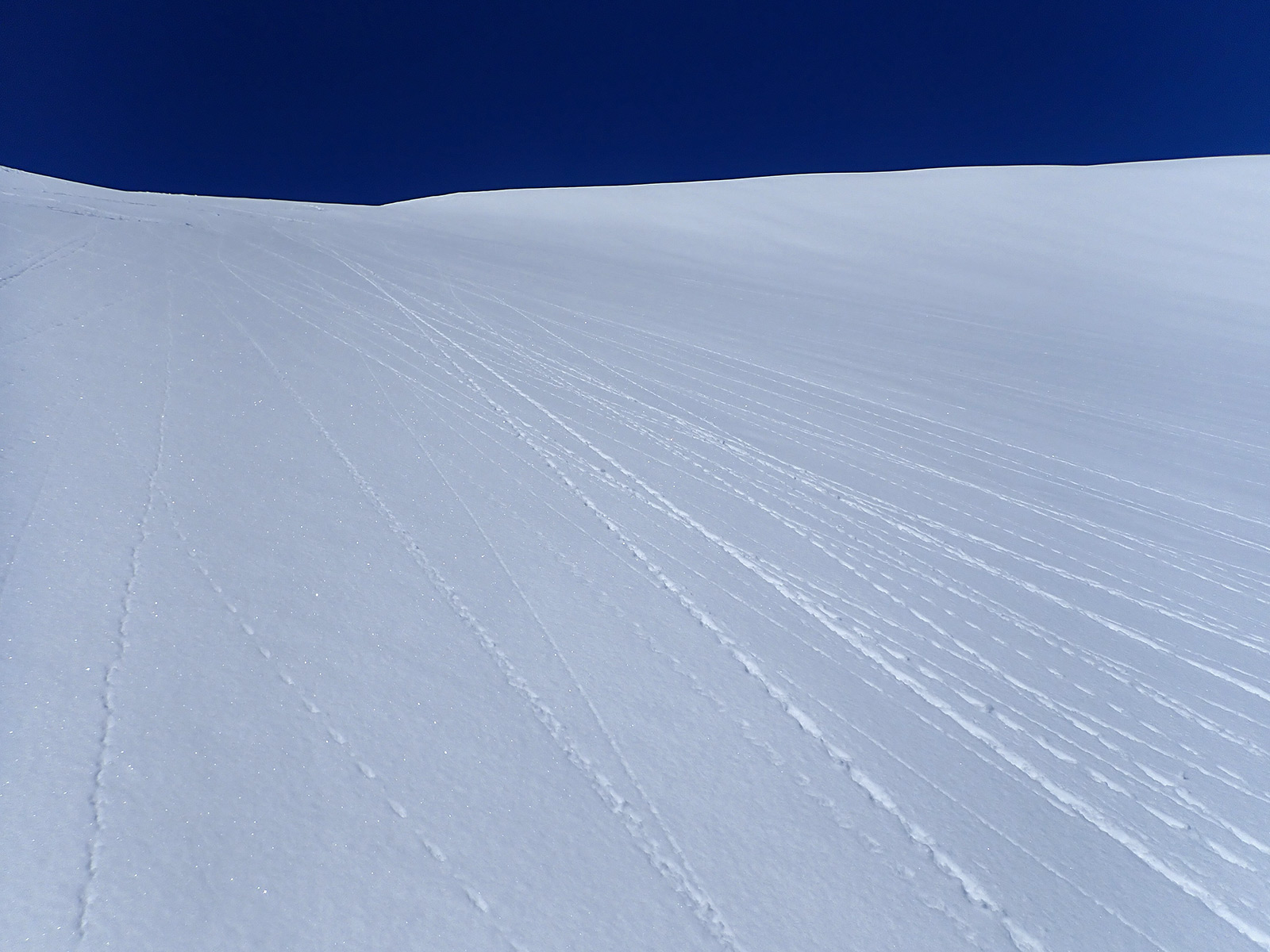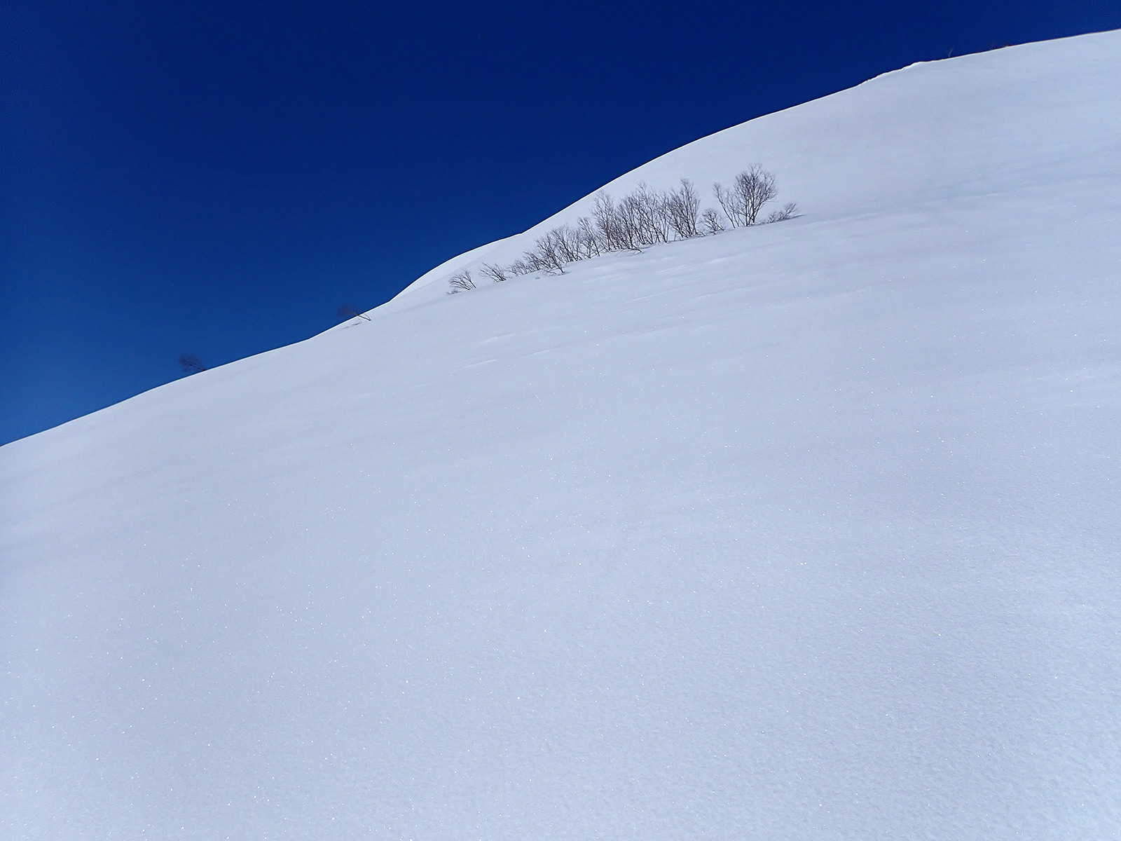 登って行く途中で吹き溜まりは20cmほど新雪が積もっていましたが、あくまで部分的でやっぱり数cm。