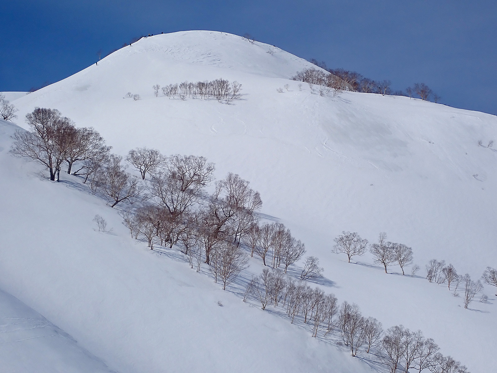 稜線から南側東側に新雪が10〜20cmほど吹き溜まっていましたが、日射の影響ですでにもっさりでしたので、北面のさらさらを期待してP2361(標高2361mのピーク)まで登って滑ってみましたが、稜線から少し下ると期待通りに柔らかい新雪が20〜40cmほども吹き溜まっていて、思いがけぬディープパウダーを楽しむことが出来ました。