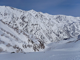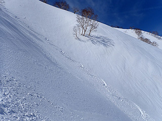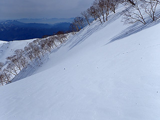 八方沢上部の滑り台。厳冬期にパウダーを滑りたかったな。