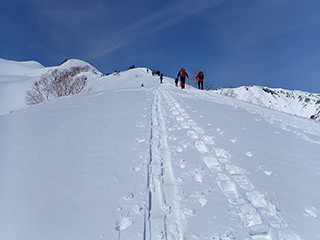 先行したスキーヤーが登りやすいトレースを付けてくれていました。