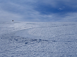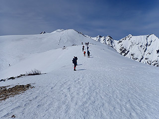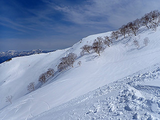 稜線より南側に前日の新雪が吹き溜まっています。日射もありすでにもっさり気味。