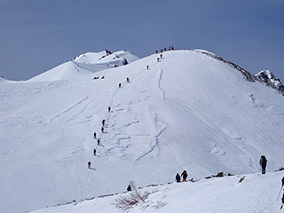 登山道をそのまま滑り降りますが、途中で滑った斜面を振り返ります。大勢の人のシュプールが刻まれています。