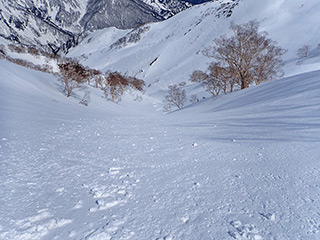 沢状地形ゆえに中心辺りに30cmほど吹き溜まっていました(^^)。この時期にこんなディープパウダーを楽しめて最高!。
