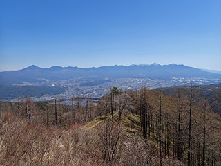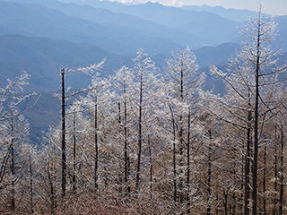 中央アルプス方面。よく見ると稜線の木々は霧氷で白くなっています。