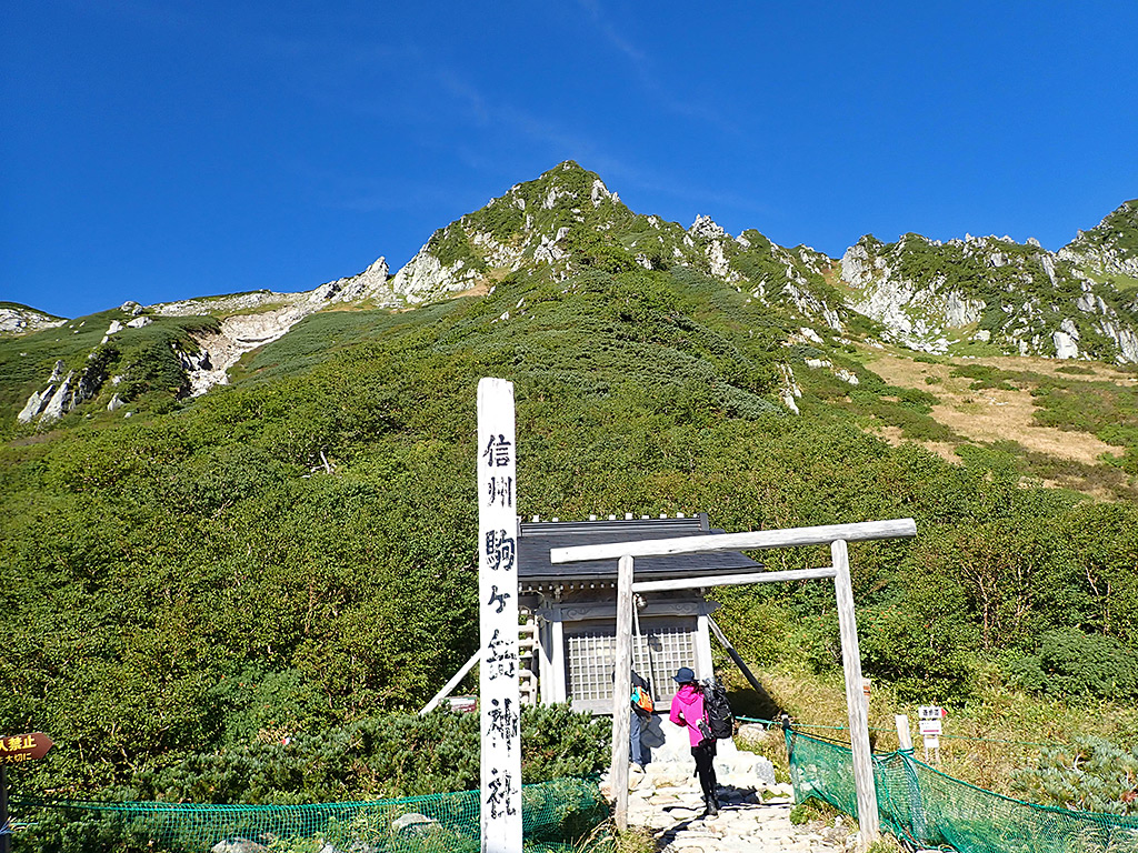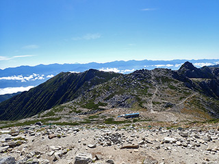 やっと岩場を抜けて一息つきます。宝剣岳を振り返って。こちら側の岩場は長く続きました。
