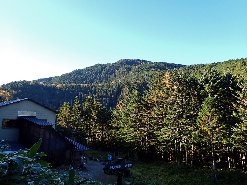7時12分、双子池ヒュッテに到着。正面に見えるピークが大岳かな。