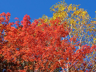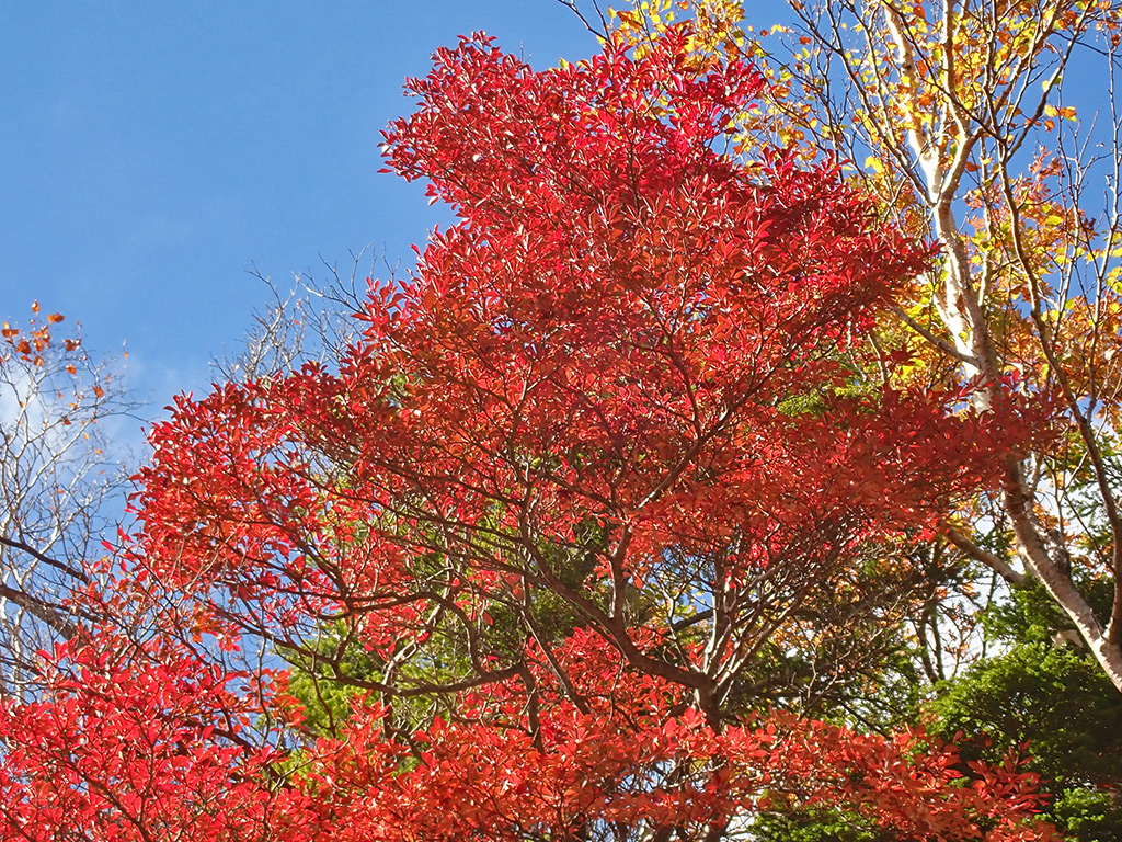 白樺高原国際スキー場の駐車場のもみじも真っ赤。なお白樺湖の紅葉はこれからという感じでした。
