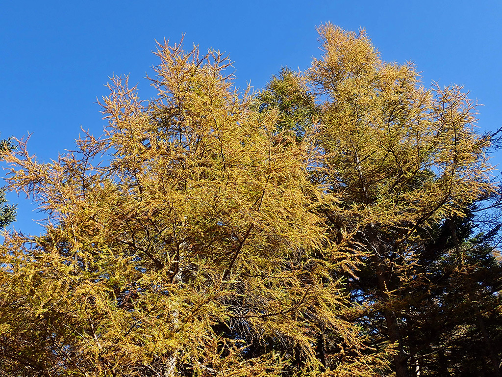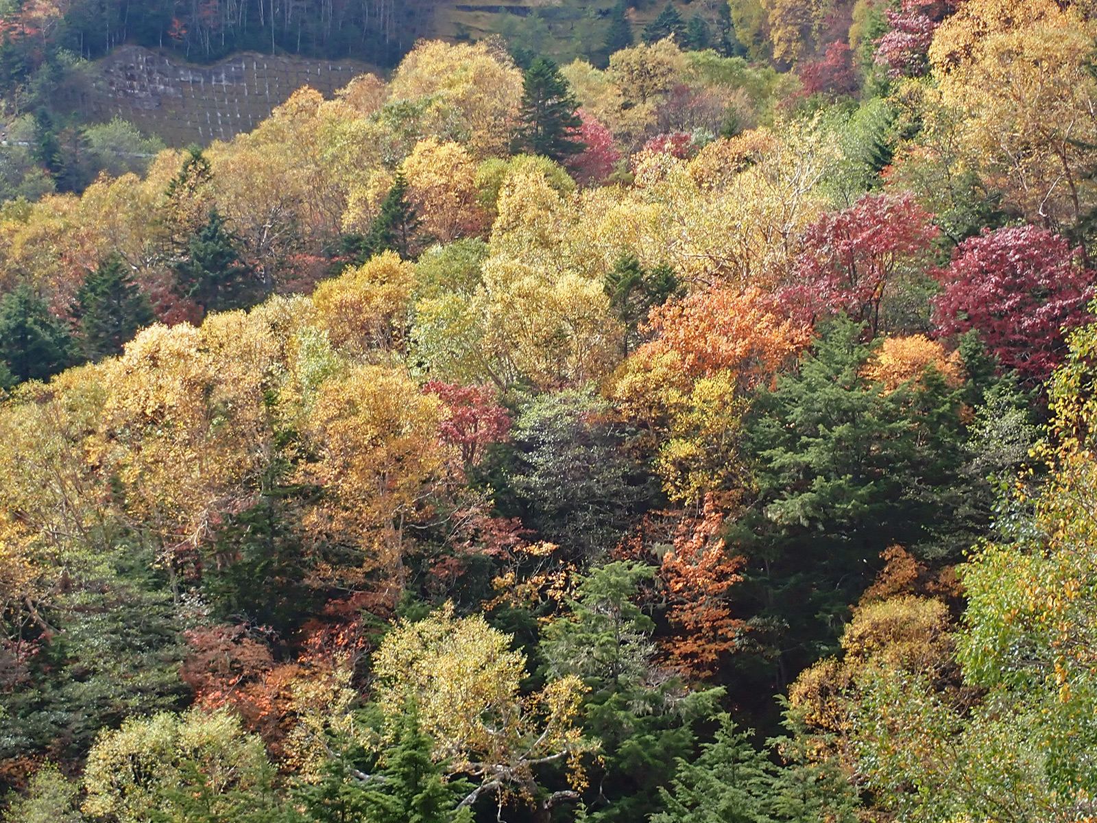 双子池雌池では紅葉に日差しが届き、まあまあのきれいな映り込みを楽しむことが出来ました。続いて亀甲池に向かいましたが、こちらは思った以上にナナカマドが多く、真っ赤な紅葉を楽しむことが出来ました。大河原峠周辺の道路脇の斜面の紅葉ですが、ちょうどピークという感じで見事でした。