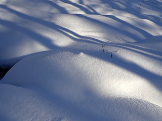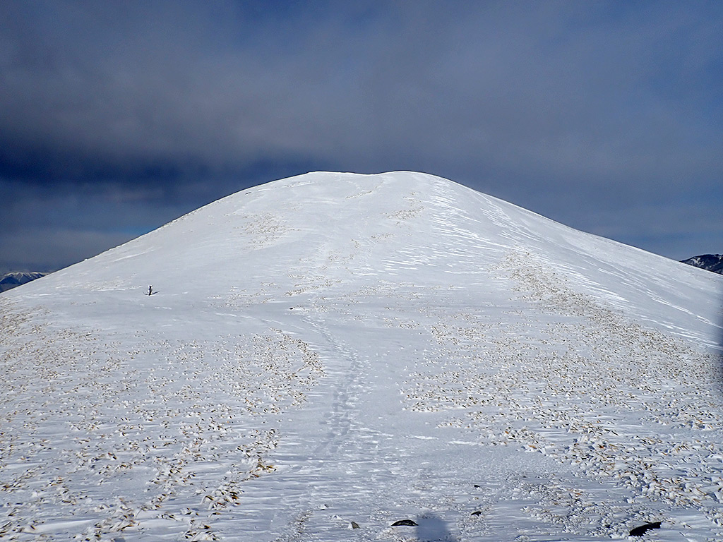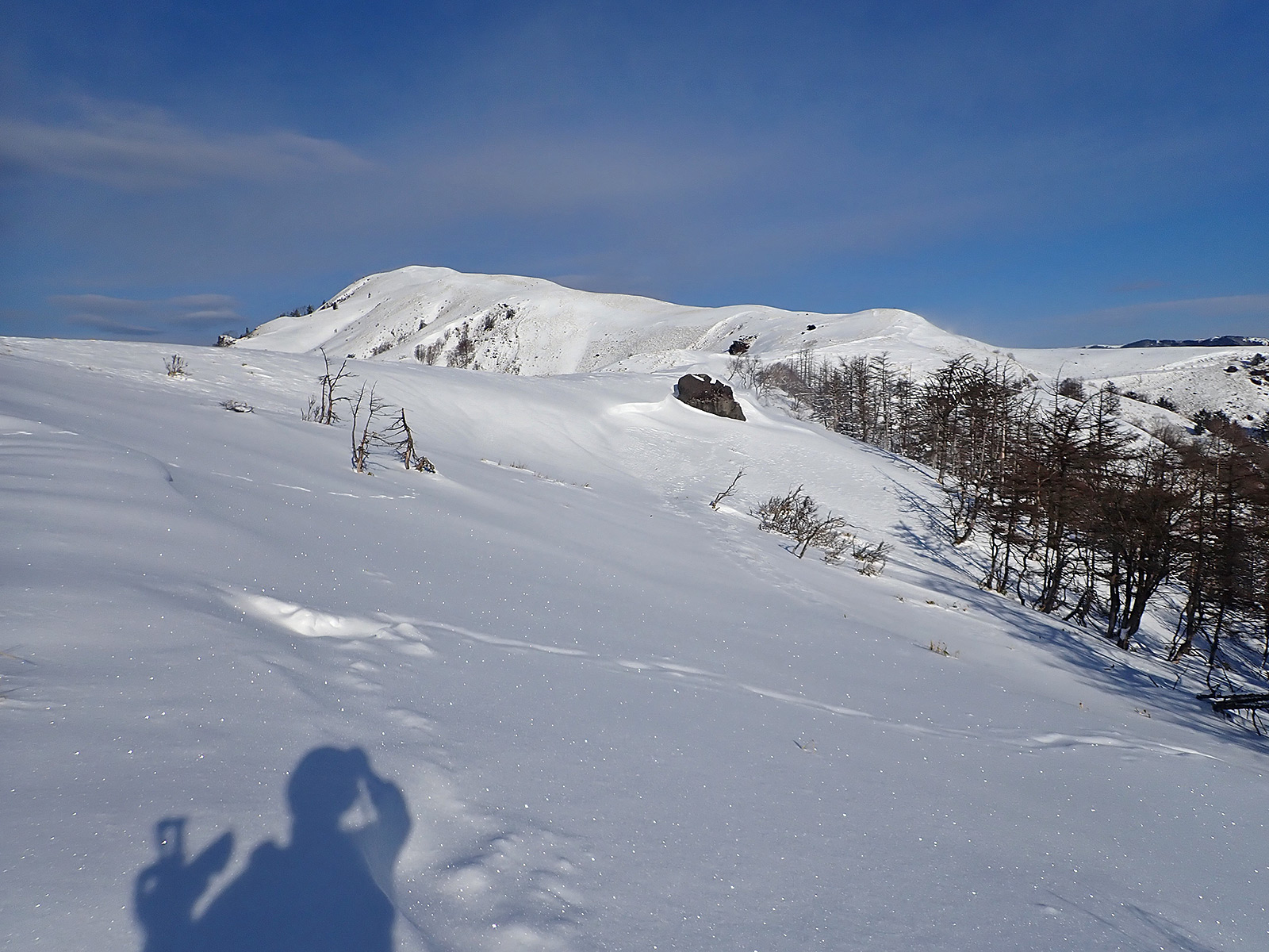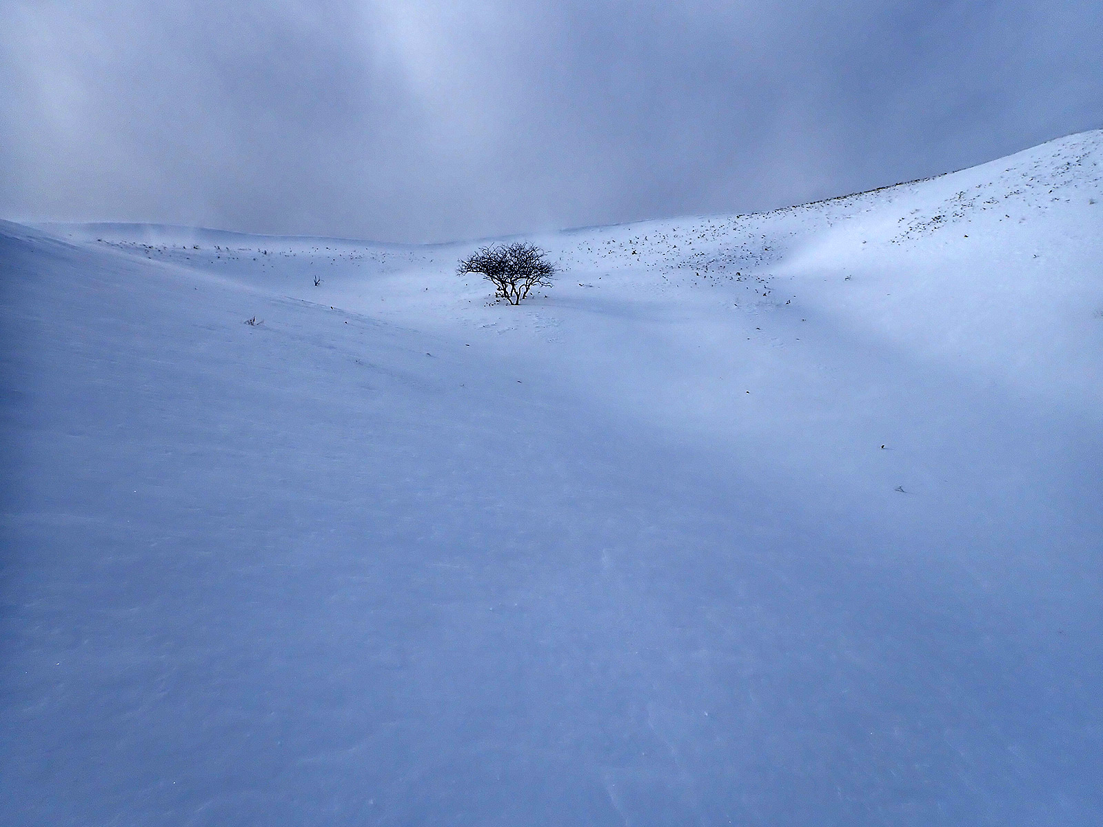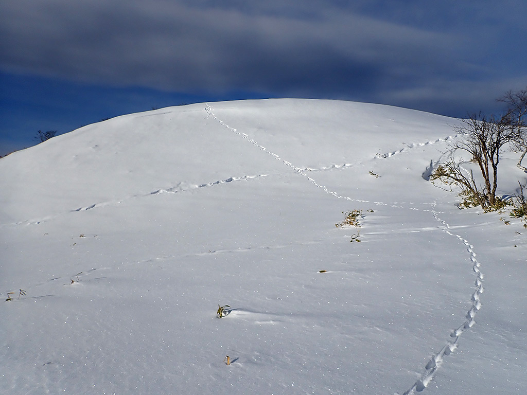 ここからしばらく吹き溜まりで雪が深くなります。スキーでも時々30cmほど沈みます。スノーシューでも腰ラッセルの予感。