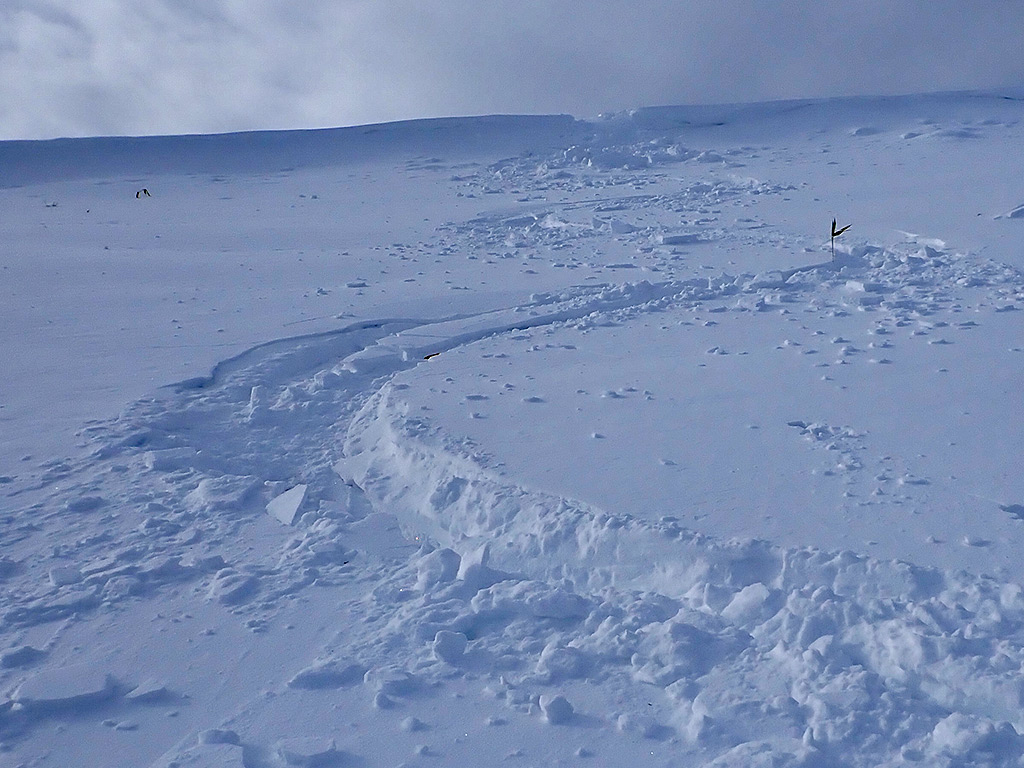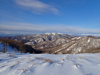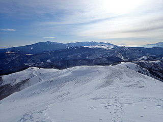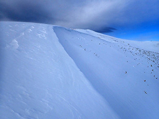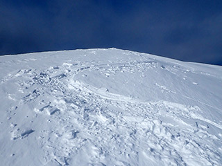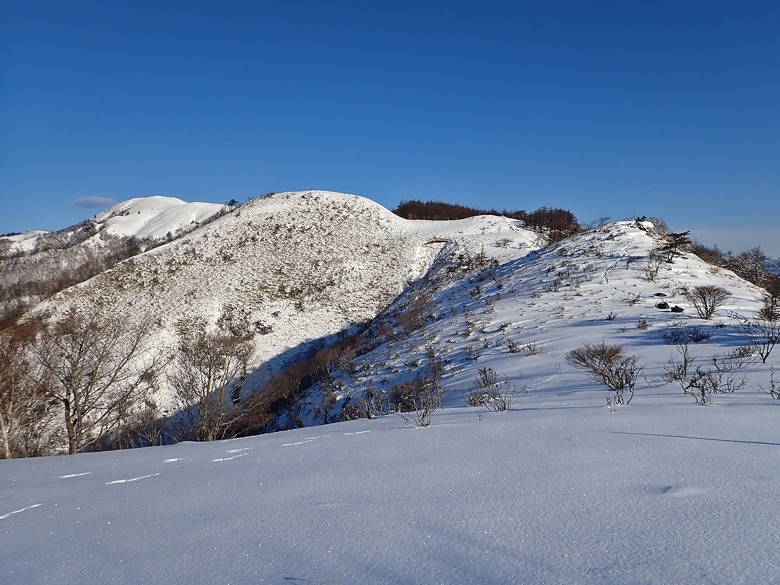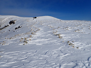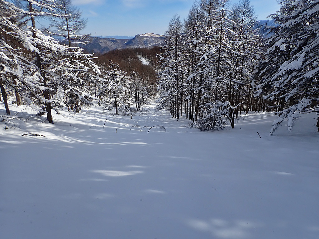 一昨日の夜に降雪があったようで、その新雪がこの冷え込みでまだ残っていればと期待したのですが、残念ながら稜線では烈風が吹き荒れ、斜面も全体的に風の影響を受けていて、さらさらパウダーではありませんでした。