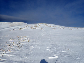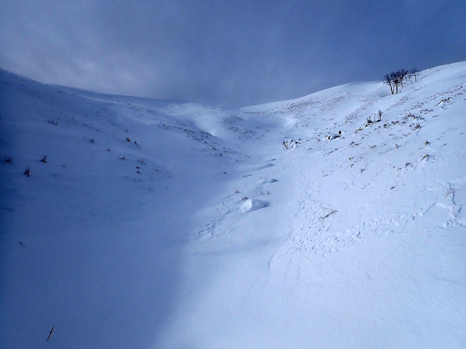 ここから先は風がほぼ無くなり(右側の斜面が風よけになるので)、トレースをありがたく使わせてもらって滑り降りて行きます。積雪は30cm以上あるので、トレースが無ければ間違いなく下りラッセル(^^;。