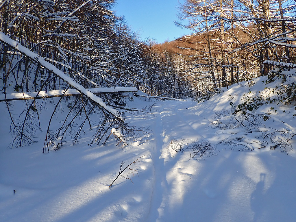 次の右カーブで沢沿いのショートカットルートへ。積雪は30cmほどあり問題ありません。