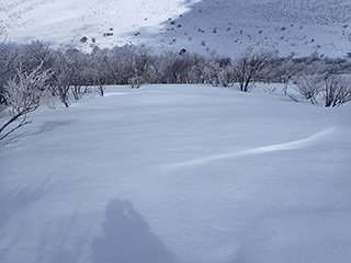 吹き溜まり。北面もこれくらい吹き溜まっていると期待したのですが(^^;。